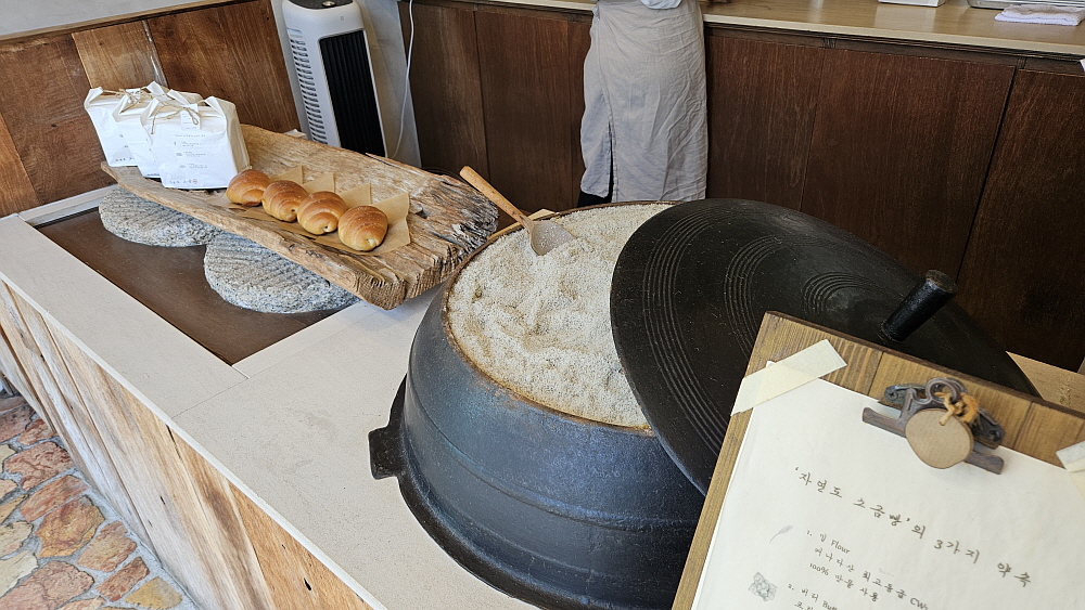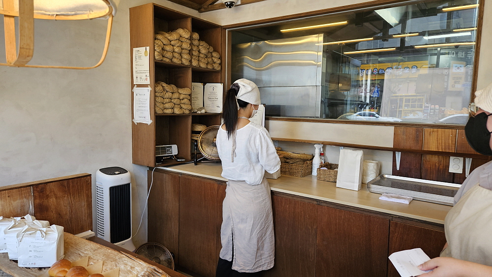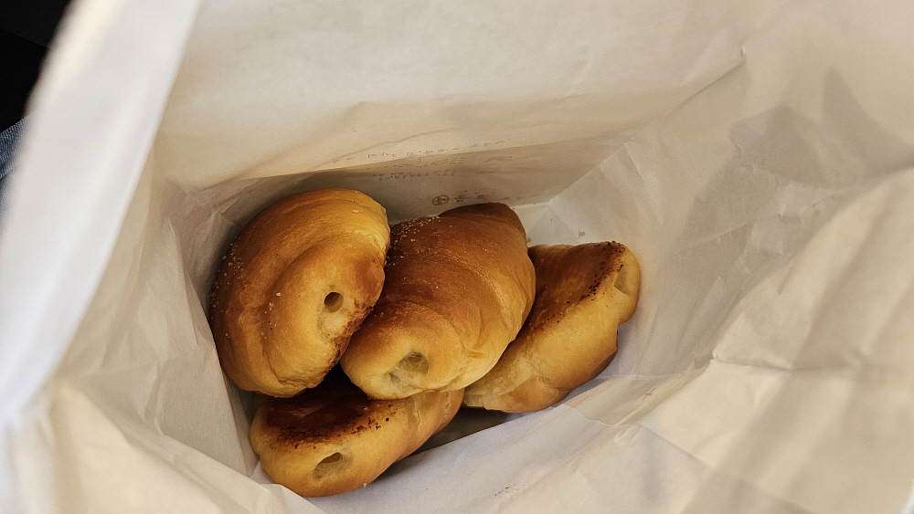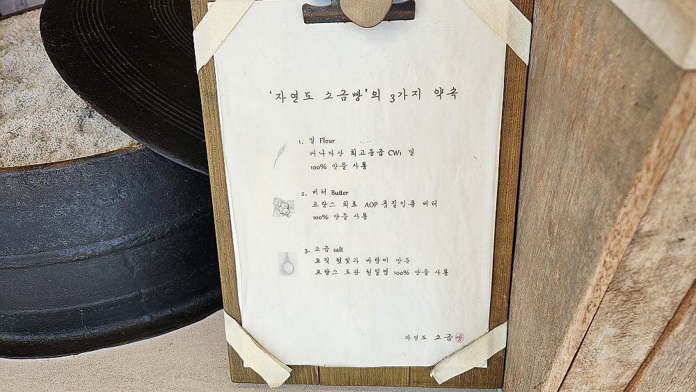 이곳의 이름은 '자연도 소금빵'이었다. 앉아서 먹을 자리도 없는 작은 점포에서 공장처럼 연신 빵을 굽는 곳인데 손님들이 줄을 서서 기다리라고 줄까지 쳐 놓았다. 이날은 평일 낮이라 그런지 줄을 설 정도는 아니었지만 그래도 빵을 사려는 사람이 많았다. 가게 밖으로는 소금빵을 강조하는 인테리어가 있고, 안에서는 몇 사람인지 몰라도 열심히 빵을 만들고 있었다. 하긴 밖에 있는 종업원만도 3~4명은 되는 것 같았다. 이런 작은 빵을 팔아 이 정도 인원의 인건비를 낸다는 사실 자체만으로도 놀라웠다. 도대체 얼마나 맛이 좋길래 이렇게 인기몰이를 한다는 말인가?
