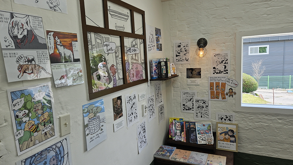유명 작가에게 자신의 얼굴을 캐리커쳐로 그려 달라는 부탁을 한다는 것은 어쩌면 참 영광스러운 일이다. 2만원이면 그런 영광을 얻을 수 있다. 우린 작가님에게 캐리커쳐를 의뢰하고 잠시 앉아 커피와 단팥빵과 소금빵을 먹었다. 여기서 빵을 만들지는 않는 것 같았지만 아침을 거르고 와서인지 참 맛이 좋았다. 달콤쌉쌀이라는 말이 실감나는 대목이다. 생각보다 카페 내부가 크지 않아 손님들 중 상당수는 밖에 있는 테이블을 이용해야 했다. 하지만 워낙 밖이나 안이나 만화 인테리어가 잘 되어 있는 편이라 여기가 어딘지는 대번 알 수 있는 분위기였다.