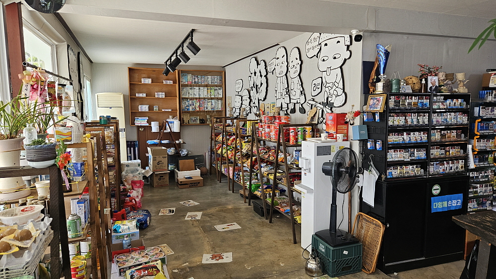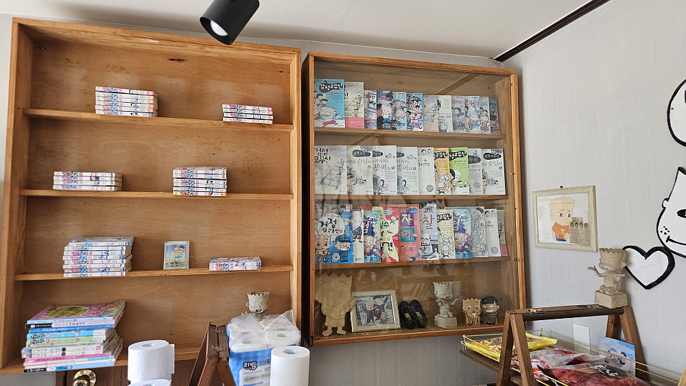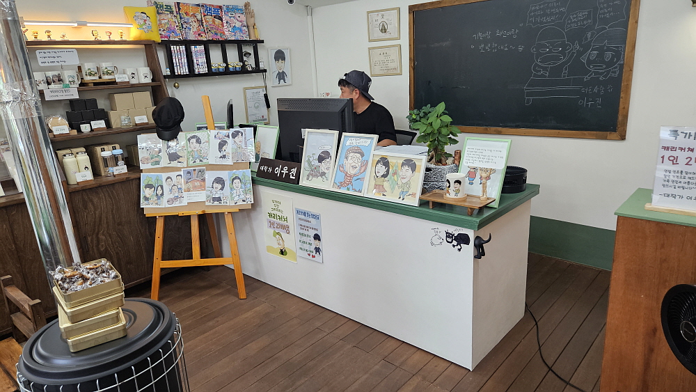 그렇게 커피와 빵을 먹다보니 어느덧 작가님의 캐리커쳐가 완성되었다. 이게 정말 나일까? 실물보다 나은데... 원래 얼굴이 거의 정사각형에 가까운데 이렇게 그려주시니 뭔가 더 부드럽고, 잘 생긴 것 같은 느낌이다. 역시 전문가는 전문가다. 카페 옆으로는 매점이 있다. 다 같은 공간이고, 가족들이 하는 곳이라 했다. 거기도 추억을 캐릭터로 감성을 풍기는 곳이다. 오래된 가게에서 느낄 수 있는 감성이 있었다. 생각해보면 빵집처럼 예전의 구멍가게도 없는 것이 없는 만물상이었다. 거기서 달라고 해서 없다고 말하는 물건이 별로 없었다. 없다면 만들어서라도 팔았던 맥가이버 같은 존재였다.