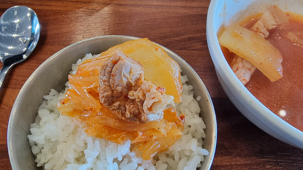 김치찌개 역시 마찬가지다. 김치를 자르고, 돼지고기도 잘게 자른다. 김치찌개는 1인분 인데도 돼지고기가 제법 많이 들어 있다. 김치찌개는 9,000원이고 두루치기는 11,000원 이란 점을 감안하면 김치찌개도 훌륭한 구성이다. 하지만 아무래도 푸짐한 비주얼은 역시 두루치기라 할 수 있다. 두루치기나 김치찌개나 같은 김치를 사용하는데 김치 자체가 제법 매운 편이었다. 당연히 두루치기나 찌개나 역시 매운 국물이 된다. 맵질에게는 쉬운 접근은 아니다. 땀 깨나 흘려야 한다. 그래도 우리에겐 하얀 쌀밥이 있어 다행이다. 쌀밥은 언제나 우리 편이기 때문이다.
