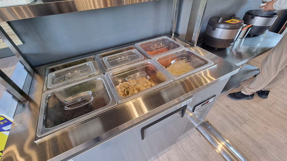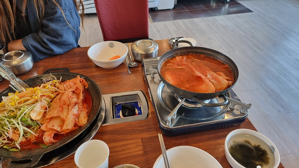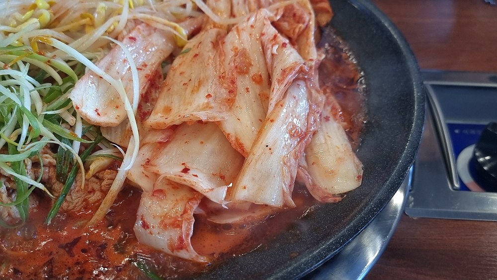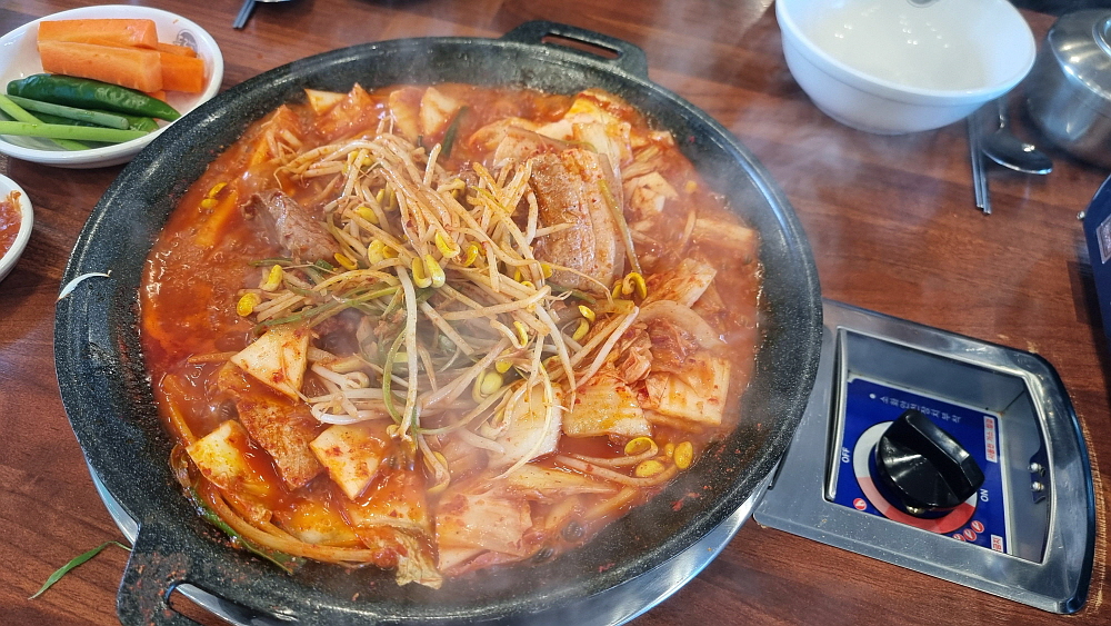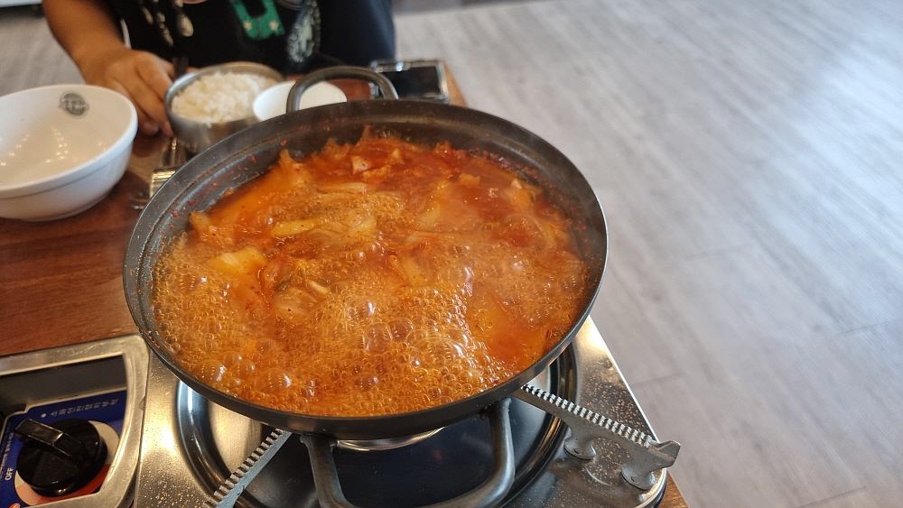 생김치가 들어간 냄비는 조금 시간을 두고 불을 가열해야 한다. 배가 고픈 사람에게 고문이나 다름없다. 주린 배를 부여잡고 김치가 익기를 인고의 시간으로 기다려야 한다. 두루치기는 국물이 적기 때문에 금새 끓어 오르고, 잘게 잘리지 않은 김치를 서둘러 잘라 주어야 한다. 뭉텅이로 들어 있는 돼지고기도 먹기 좋게 잘라야 한다. 별다른 양념을 넣은 것 같진 않지만 불로 익힌 두루치기는 금새 붉은 색의 볶음처럼 변해갔다. 먹기 좋은 상태가 곧 도래하는 것이다. 셀프코너에서 시원한 미역냉국을 가져다 마음을 진정시키면서 조금만 더 기다리면 된다.