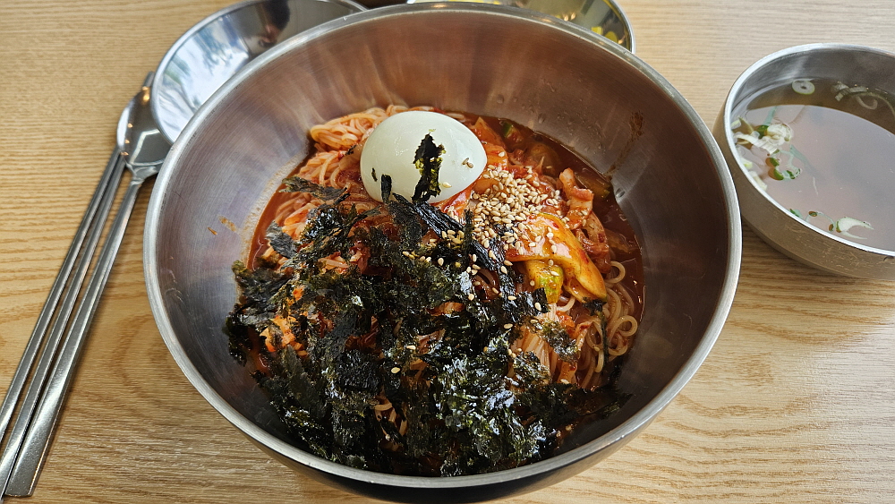우리는 멸치국수와 비빔국수를 주문했다. 서브 메뉴인 주먹밥을 주문할까 하다 말았다. 아침부터 과하게 먹으면 소화도 안 되고, 부담스럽기 때문이다. 비빔국수는 큰 기대를 하지 않고 주문했다. 1,000원이 비싸지만 대부분의 경우 비빔국수는 성공하기 힘든 아이템이다. 참 이상한 일이다. 대부분의 국수집이 비빔국수를 판다. 하지만 맘에 드는 집은 거의 없다. 비빔국수 양념이란 것이 그리 만들기 어려운 것은 아닐텐데 늘 뭔가가 부족하다. 아무튼 같은 음식으로 두 개를 주문하기는 좀 그래서 비빔국수를 주문했다. 음식이 나오고 나서 보니 엄청 자극적일 것 같은 비주얼이었다.