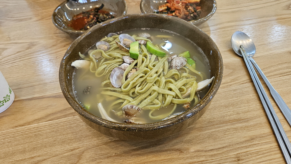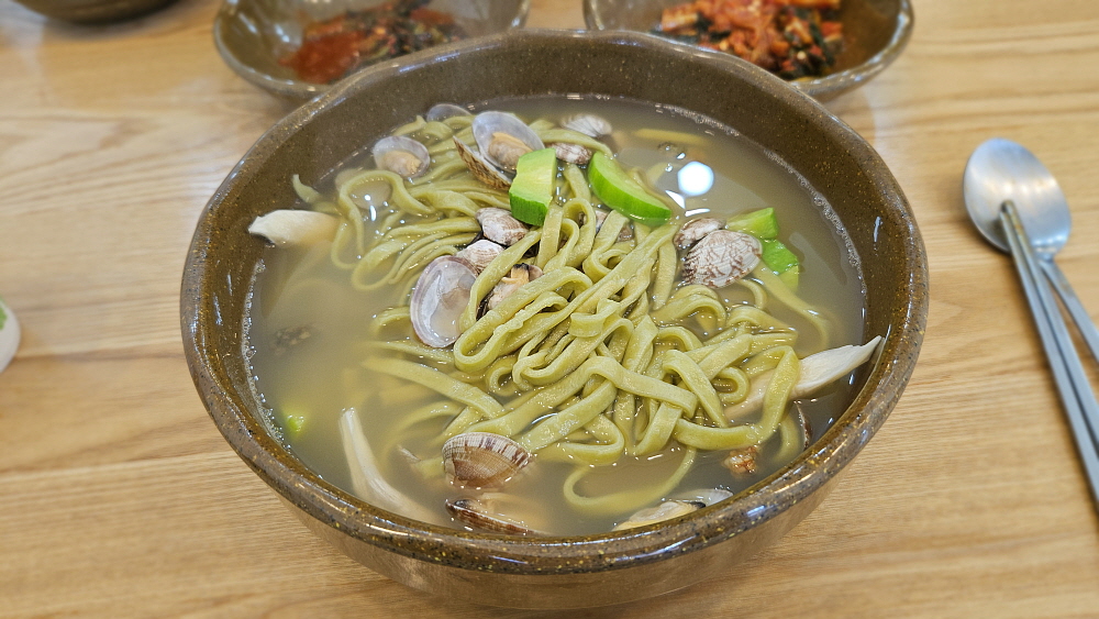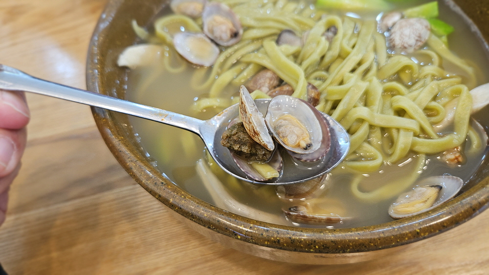 귀여운 고추장 통에서 조금 덜어낸 고추장이 풍미를 더하는 보리밥을 먹고 있자니 드디어 오늘의 메인 디시인 칼국수가 나왔다. 주문하고 5분 정도밖에 안 된 것 같은데 정말 빨리도 나왔다. 이상할 정도로 빨리 나온 칼국수이지만 국물은 아주 깊은 맛이 났다. 바지락 칼국수는 조개 먹는 재미도 있지만 역시 국물이 시원하고 조개 특유의 진한 맛이 나야 제대로 만든 것이다. 물론 육수를 미리 만들어 놓았겠지만 어찌나 깊은 맛이 나는지 신기했다. 그런데 국물이 뽀얀 것이 담백해 보였는데 어찌나 맵던지 혼났다. 아마도 육수를 만들 때 매운 고추를 함께 넣고 끓이는 모양이다. 맵질에겐 쉽지 않은 도전이었다.