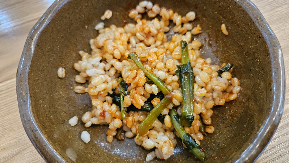 칼국수를 주문하고 잠시 앉아 있으면 꽁당 보리밥을 조금 내어준다. 칼국수 한 그릇에 만 원인데 보리밥을 주니 웬지 뭔가 그냥 덤으로 받은 느낌이었다. 이런 보리밥이 흔하다면 흔한 것인데 집에선 잘 먹게 되지 않는 것이 사실이다. 들기름이 조금 들어간 보리밥에 열무 김치를 넣고 고추장을 넣어 비비면 칼국수 집에서 자주 보게 되는 에피타이저가 되는 것이다. 정말 별 것 아닌데 이상하게도 맛이 난다. 그래서 우린 꼭 집에서도 해 먹어 보자고 말하곤 하는데 실천한 적은 없다. 마치 후라이드 치킨 집에 있는 슬라이스 한 양배추를 소스에 발라 먹는 단촐한 반찬을 꼭 집에서도 먹어보자 말하는 것이나 마찬가지이다.