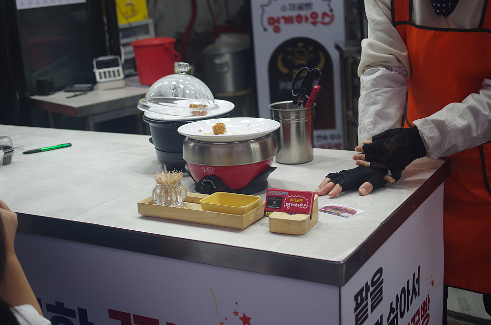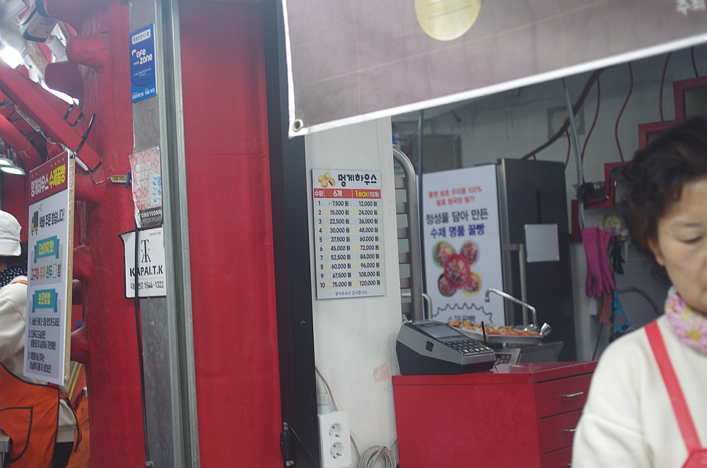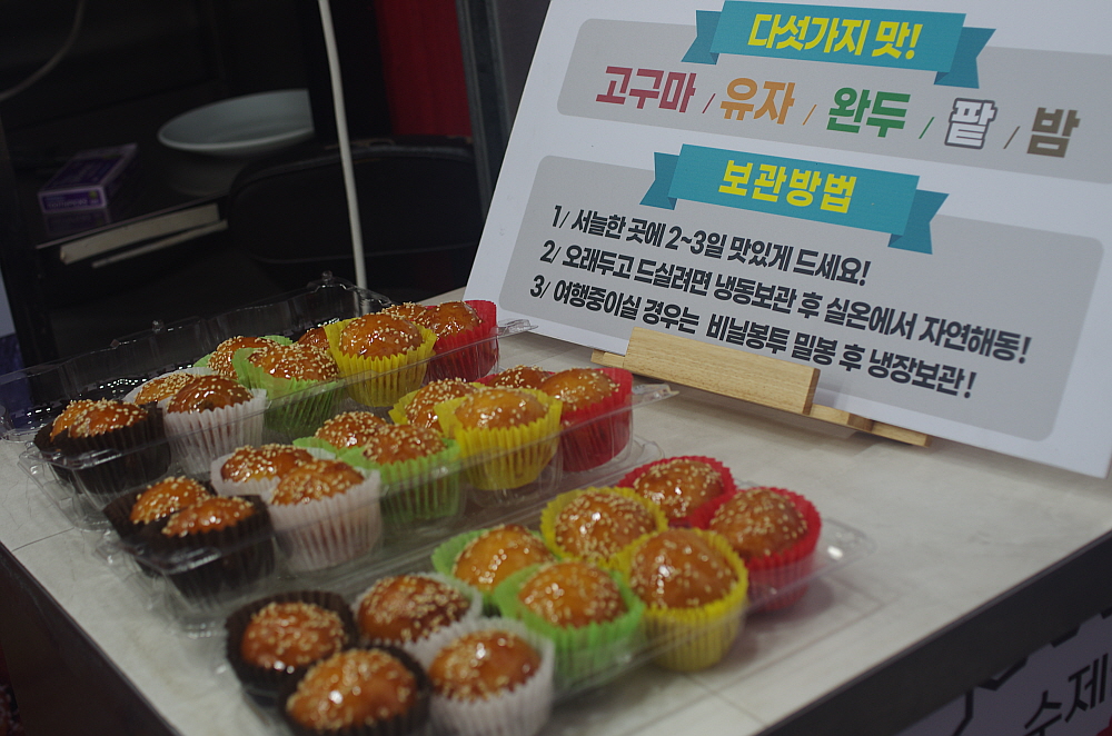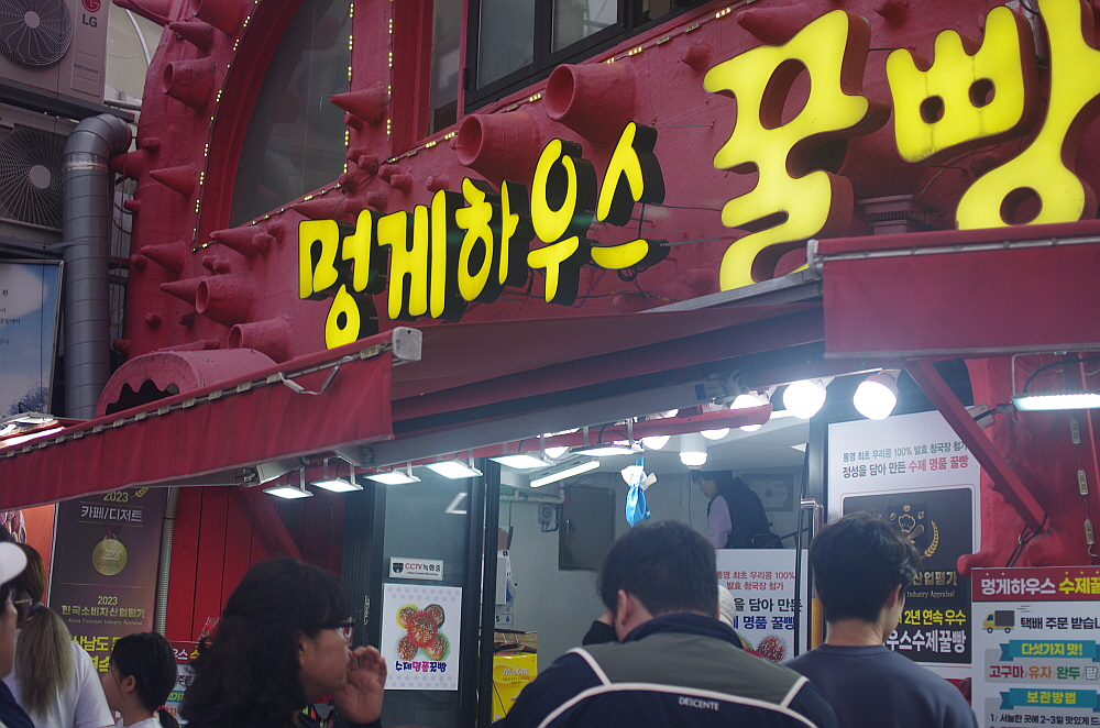 잘 모르는 동네를 가면 사람들로 북적이는 곳을 찾게 마련이다. 우리도 이날 그랬다. 많은 꿀빵집들 가운데 유독 이집에 손님이 가장 많아 보였다. 이름은 멍게하우스 라는 곳이다. 꿀빵과 멍게가 무슨 관계가 있나 몰라도 아무튼 사람들은 조금씩 먹게 주는 시식코너에 정말 많이 모여 있었다. 글쎄 비주얼만 봐서는 어디가 낫다는 생각을 할 수 없는데, 조금 먹어보니 멍게하우스의 꿀빵이 가장 부드럽고, 야들야들한 것이 덜 달았다. 그럼 이집이 좋겠군... 하는 생각을 하면 다음날 올라가기 전에 다시 오기로 했다.