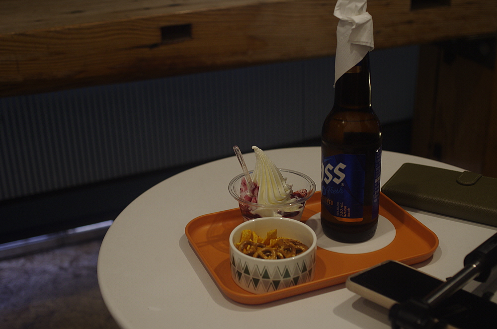 이곳은 맥주도 있었다. 우린 달달한 아이스크림과 맥주를 들고 2층으로 올라갔다. 그래야 바다봄의 매력을 제대로 느낄 수 있다. 시간이 조금 늦은 탓도 있고, 일요일 밤이라는 시간적인 면도 있고 하여 카페는 사람이 거의 없었다. 리뷰를 보면 이 카페가 그렇게 많은 사람들이 찾는다고 했는데 말이다. 카페에서 바라보면 마시는 맥주 한 잔의 여유는 이번 여행에서 가장 즐겁고, 편안한 시간이었다. 밤바다가 주는 묘한 아늑한 기분에 알딸딸한 상태까지 더해지니 그냥 앉아만 있어도 맘이 착 가라앉는 것이 진정한 힐링 여행이었다.