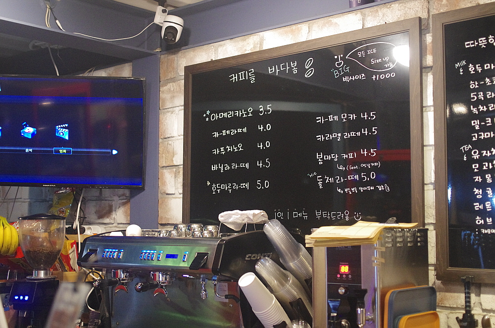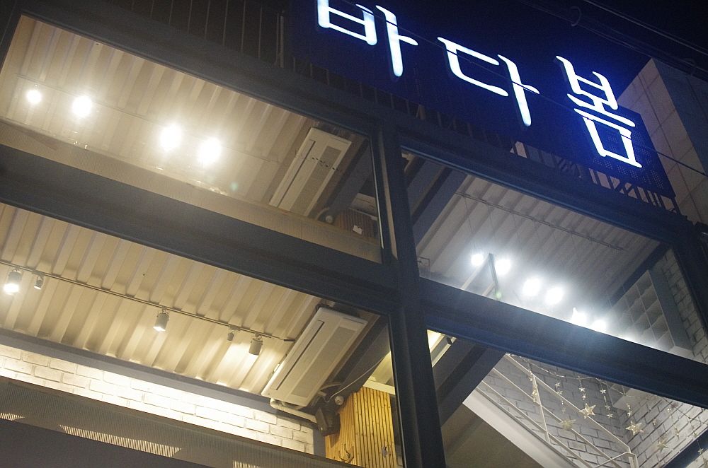 가격은 다 비슷하다. 포장해서 가지고 갈 수 있는 작은 박스가 12,000원 이었다. 박스 안에 10개의 꿀빵이 들어 있다. 이걸 비싸다고 해야 할지 아님 적당한 가격이라 해야할지 잘 모르겠다. 아무튼 아침 일찍 문을 연다니 다시 오기로 하고 먼저 봐 두었던 카페로 가기로 했다. 바다를 바라 보면 차나 맥주를 마시라는 의미의 바다봄 이라는 카페이다. 아주 작은 면적의 카페이지만 바다쪽으로 온통 창이 나있는 신기하게 생긴 카페였다. 꼭 이 카페에서 보지 않더라도 통영의 밤바다는 무척이나 아름답고, 인상적이긴 했다.