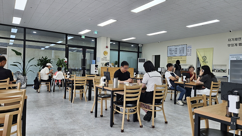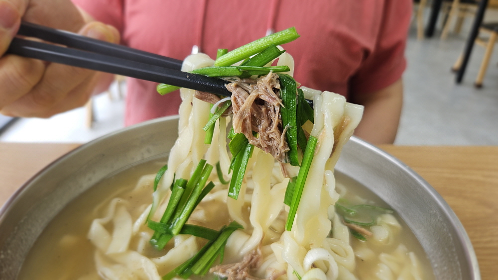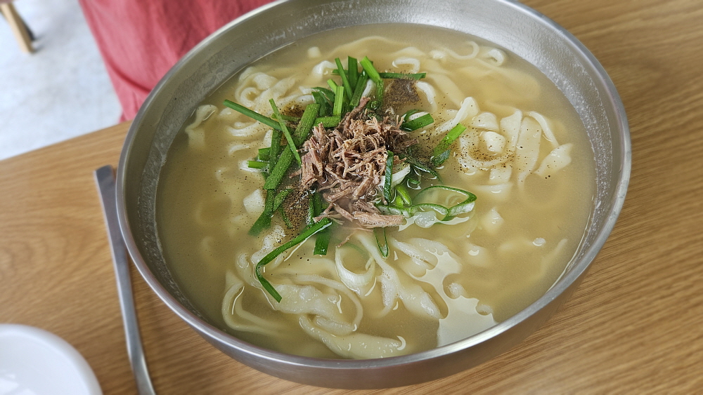 새 건물에 새 인테리어로 이집의 첫 인상은 엄청 깔끔하고 깨끗하다는 것이다. 과연 여기가 칼국수 집인지, 카페인지 헛갈릴 정도였다. 하지만 분명 칼국수집이 맞다. 보통 칼국수 집들은 어떤 주재료를 사용하는 메뉴판이나 간판에 써 있다. 예를 들면 사골칼국수, 해물칼국수, 바지락칼국수 등등 처럼 말이다. 손님들은 밖에서 이런 재료를 보고 본인이 좋아하는 것이면 들어 오는 경우가 많다. 하지만 이집은 그런 표시가 없다. 그러니까 그냥 칼국수인 셈이다. 나중에 먹고 나서 보니 일종의 혼합 국물인 것 같다. 멸치 냄새도 나고, 디포리나 명태 같은 맛도 나고, 약간은 고기 냄새도 난다.
