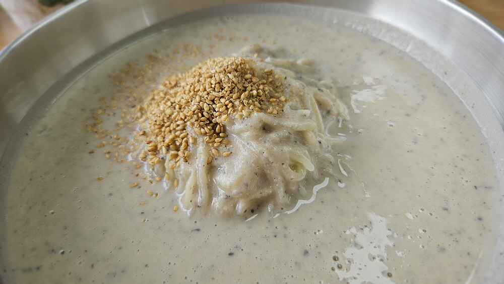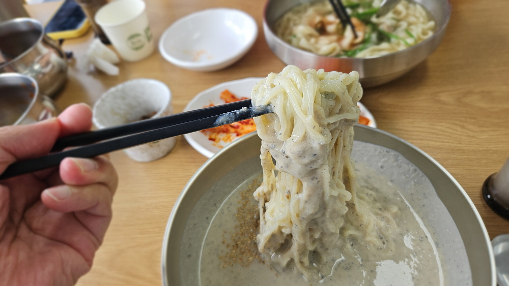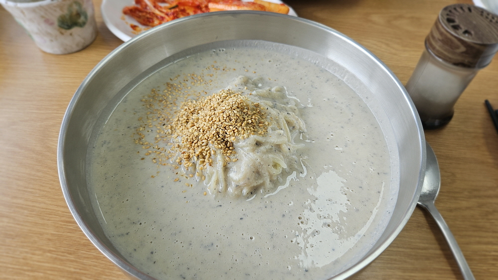 드디어 메인 디쉬인 칼국수와 콩국수가 나왔다. 결론부터 말하자면 칼국수보다 콩국수가 엄청 고소하고 진하고 정말 맛이 좋았다. 이런~ 칼국수는 고기 고명이 올라가 있었다. 역시 국물에 고기를 넣기는 하는 모양이다. 그런데 아주 복합적이고 오묘한 맛의 국물이었다. 어디서 먹어 본 적이 있는 것도 같도, 아닌 것도 같고 아주 희안한 맛인데 조합이 훌륭했다. 비슷한 맛들을 내는 칼국수집이 전국적으로 많이 있기는 할 것이다. 콩국수는 완전 압권이었다. 어찌나 국물이 걸쭉한지 콩죽인줄 알았다. 국물이라고 하기 보다는 엑기스라 표현하는 것이 더 맞을 법한 농축된 콩물이었다.