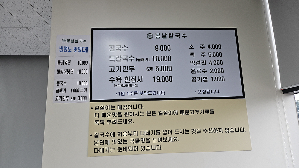 한국 사람들의 외식 메뉴가 다양한 것 같지만 실상 따지고 보면 그렇지도 않다. 나른하고 여유있는 휴일 오후 점심으로 무엇이 가장 적당할까 생각해 봤는데 온통 국수밖에 떠오르는 것이 없었다. 국수도 여러 버전이 있지만 이날은 비도 내리고 뭔가 속을 뜨끈하게 채워줄 국물이 필요했다. 국수와 뜨끈한 국물이라면 역시 칼국수일 것이다. 요즘 이런 분위기를 반영이라도 한듯 칼국수집이 여기 저기 많이 생겼다. 결국 사람들의 취향은 거기서 거기라는 것이다. 우리가 선택한 곳은 양주시 삼숭동의 '봄날 칼국수'였다. 이집은 지나면서 자주 보았던 곳이다. 새로 지은 건물 2층에 있어 눈에 잘 띄였다.