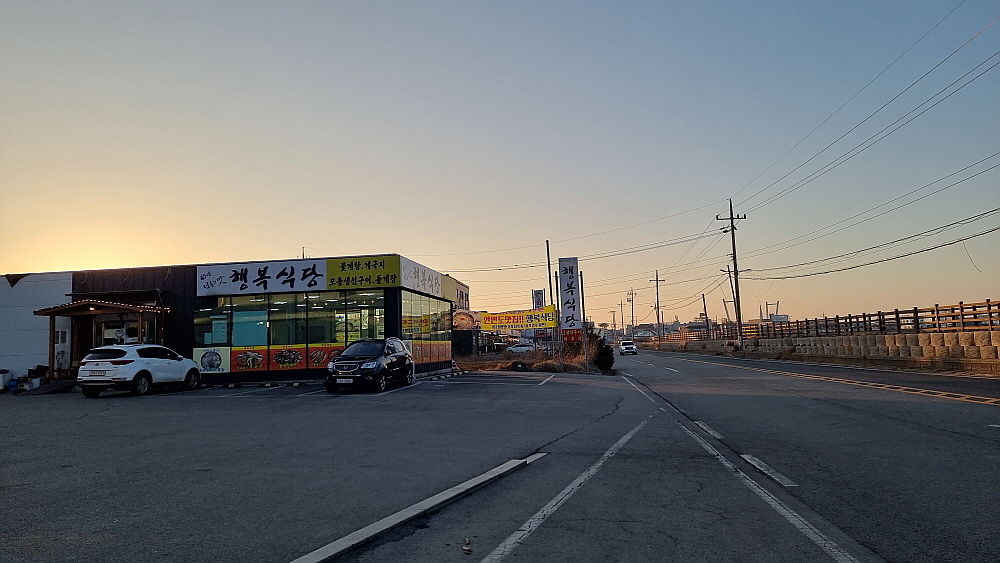 그러다 한 집을 발견하고 들어갔다. 한창 때 시즌에는 예약을 하지 않으면 안 될 정도로 잘되는 집이라던데 이날은 아주 한가했다. 여기서는 항구가 더 잘 보였다. 밀물과 썰물의 차이가 큰 서해안의 특징 때문에 만조에 가까운 이 시간에는 뻘에서 조개를 캐는 사람들은 없었다. 하지만 바다는 더없이 잔잔했다. 과연 저것이 바다가 맞을까 싶을 정도로 아주 평온 그 자체였다. 안면도라는 이름이 혹 저렇게 평온한 바다 때문에 붙여진 이름일까? 숙소에서 식당까지는 걸어서 20분 이상 걸리는 가까운 거리는 아니었다. 하지만 오는 동안 길에서 만난 사람이 없다. 신기할 정도로 한가하고, 고요한 안면도의 저녁이었다. 물론 다음날은 전혀 다른 풍경이 연출되었지만 말이다.