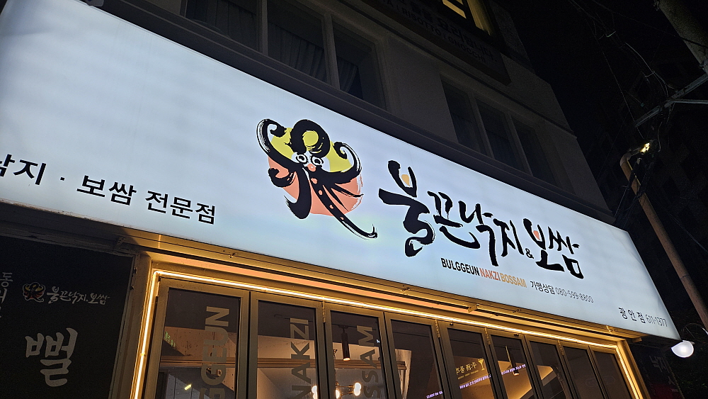 부산 여행지 중에 우리가 가장 좋아하는 곳은 광안리이다. 누군가는 그랬다. 나이든 사람들이 자꾸 광안리에 가려고 하면 안 된다고... 그만큼 광안리는 젊음이 살아 숨쉬는 곳이다. 우리는 숙소 엘리베이터에서 멕시코에서 광안리로 여행왔다는 젊은 커플을 만나기도 했다. 여기는 정말 국제적인 젊음의 도시인 것이다. 이번 숙소는 광안리의 한 중간에 위치한 곳으로 그 어느 때보다 광안리를 제대로 즐길 수 있었다. 여행의 묘미는 역시 먹는 것이다. 우리는 숙소 주변에서 미리 봐 두었던 이곳으로 향했다. 여기 이름은 '불끈 낙지 & 보쌈'이라는 체인점 식당이다. 하지만 이런 이름의 식당을 다른 곳에서는 보지 못했다.