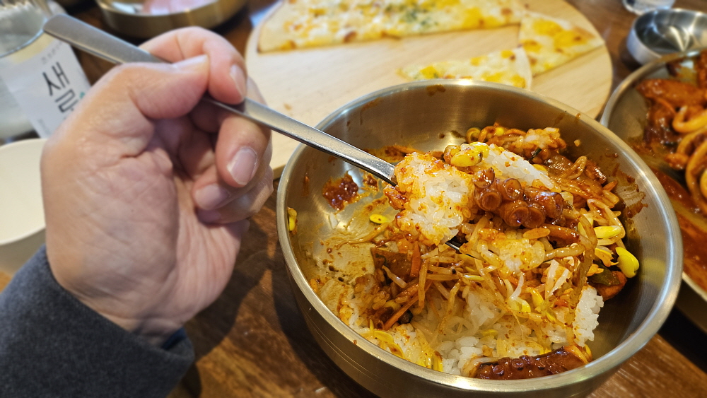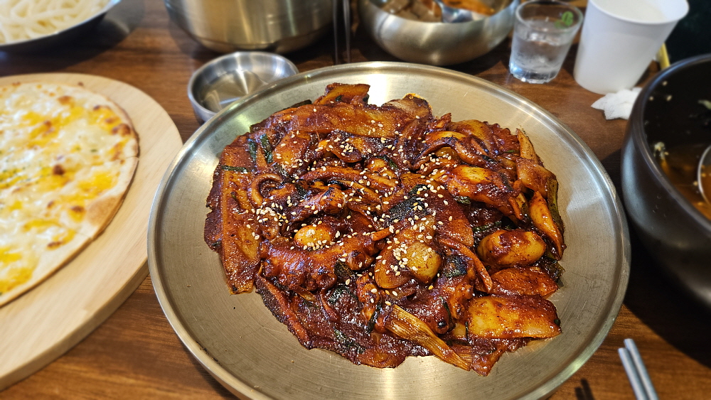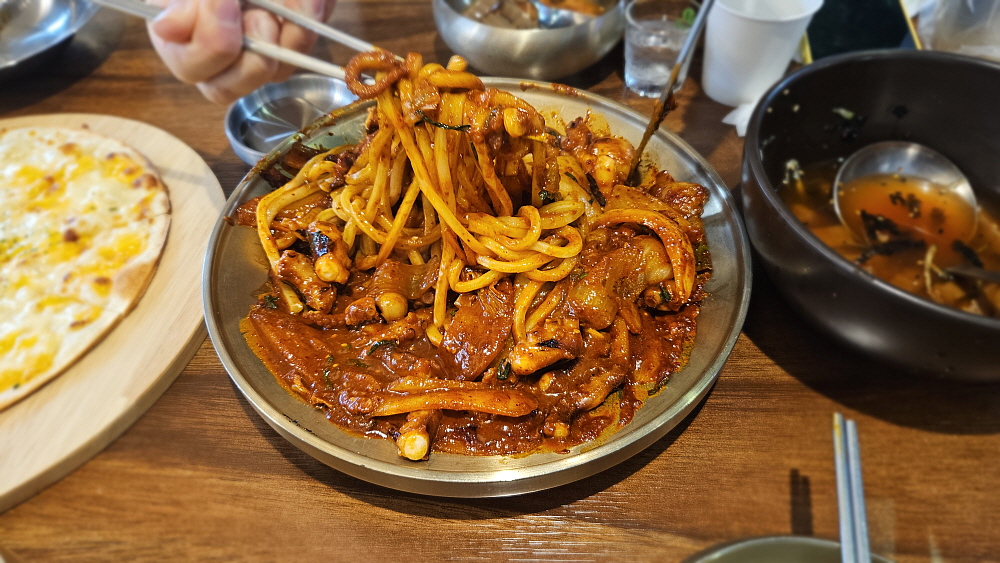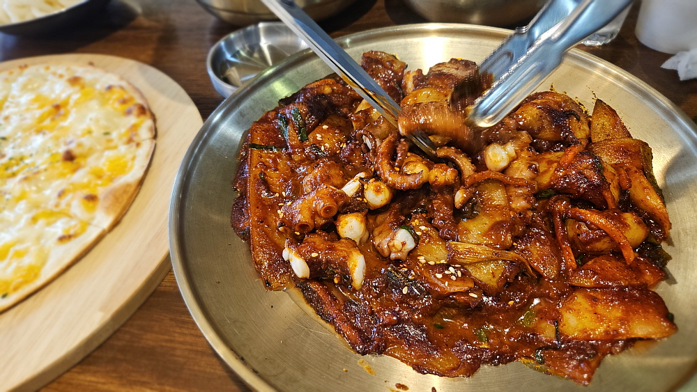세트메뉴로 주문하면 고르곤졸라 피자도 나온다. 그리고 대망의 낙지... 우린 정말 깜짝 놀랐다. 무슨 낙지가 문어만한 크기였기 때문이다. 이렇게 큰 낙지는 거의 본적이 없는 것 같다. 어찌나 크던지 낙지 다리를 가위로 서 너 번을 잘라 먹어야 할 정도였다. 정말 크기만봐서는 문어라 우겨도 누가 뭐라하지 않을 정도였다. 부산하면 화끈하게 매운 맛이라지만 맵기도 아주 센편은 아니었다. 먹기 좋은, 기분좋을 만큼의 맵기였다. 이러면 소주의 훌륭한 친구가 된다. 낙지볶음은 비슷하게 생긴 오징어나 쭈꾸미보다는 확실히 고급진 음식이다. 과거엔 가격 비교가 안 될 정도로 낙지 몸값이 귀했지만 요즘 하도 오징어가 잡히지 않아 조금은 비슷한 느낌이 되었다.