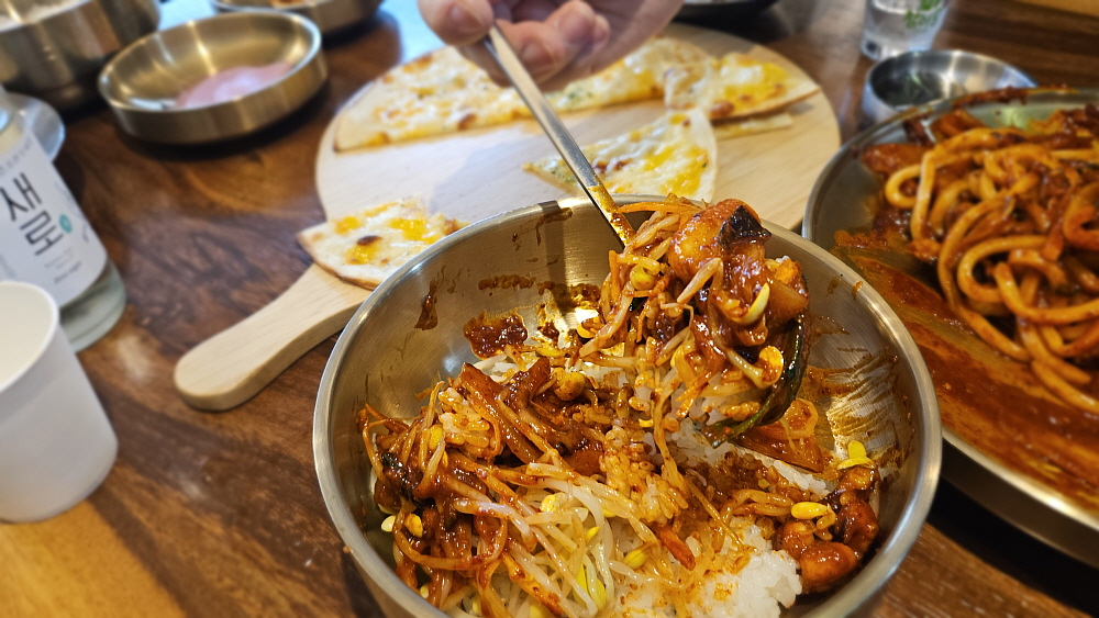 그렇다고 밥을 먹지 않을 수 없어 볶음 양념을 밥에 비벼서도 먹었다. 밥은 꼭 콩나물을 함께 넣고 비벼야 맵기도 조절이 되고, 맛도 배가 되는 법이다. 예전에는 이렇게 낙지볶음 밥을 자주 먹었던 것 같은데 요즘은 주변에 낙지볶음을 파는 집이 별로 없다. 낙지가 귀해서인지, 낙지볶음을 만들기 어려워서인지 잘 모르겠다. 아무튼 이렇게 낙지볶음밥을 먹으면 제대로 한 끼를 먹는 기분이 든다. 술 안주로도, 식사로도 너무나 훌륭한 음식이 바로 낙지인 것이다. 우리는 천천히 음미하듯 저녁을 먹었다. 이렇게 맛난 음식은 번갯불에 콩볶듯 먹으면 아쉬운 법이다. 성대한 만찬상처럼 그렇게 즐거운 마음으로 낙지를 맛나게 먹었다.