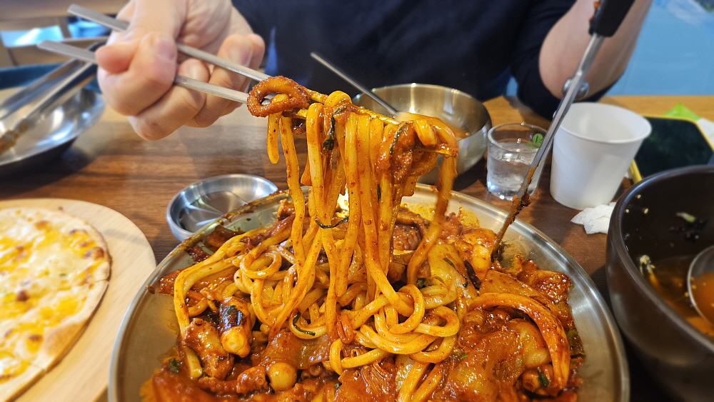 밥이 따로 나오기는 하지만, 우리는 우동사리도 주문했다. 이런 양념은 밥에 비벼도 일품인 거 맞지만, 역시 우동 사리 하나 넣어 먹어야 제맛이다. 우리의 예상은 적중했다. 간간한 양념과 우동사리는 정말 잘 어울렸다. 밥에 비빌 때와는 또 다른 맛을 보여주었다. 낙지볶음이라고는 하지만 마치 낙지찜 같다고 해야할까? 양념이 그런 맛이었다. 아구나 해물을 넣은 찜 같다고 할까? 이렇게 다소 강한 맛이 나는 볶음이 낙지를 대변하는 맛이리라. 부산이라는 감성이 더해져 이날의 저녁은 정말 근사했다. 먼 여행길의 피로가 낙지 한 점과 소주 한 잔에 다 녹아버리는 느낌이었다.