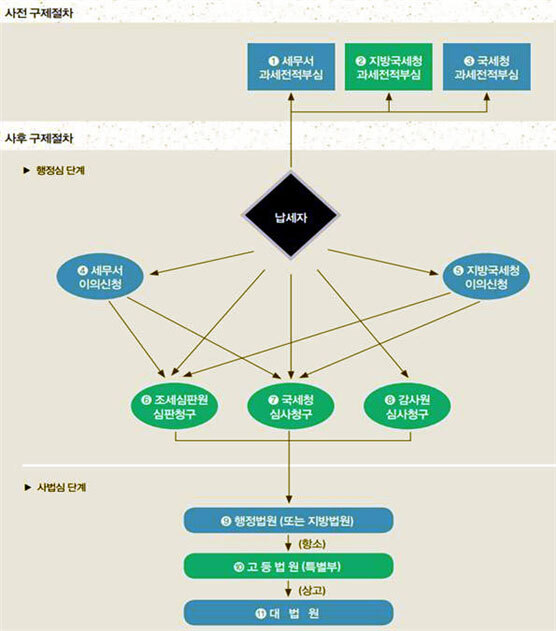 세법에서 정하는 구제 절차로는 납세 전 과세전적부심사청구를 하는 사전구제절차와 세금고지서를 받고 난 후 이의신청이나 심사·심판청구를 하는 사후구제 절차가 있다.
