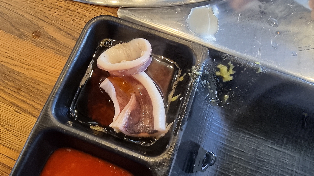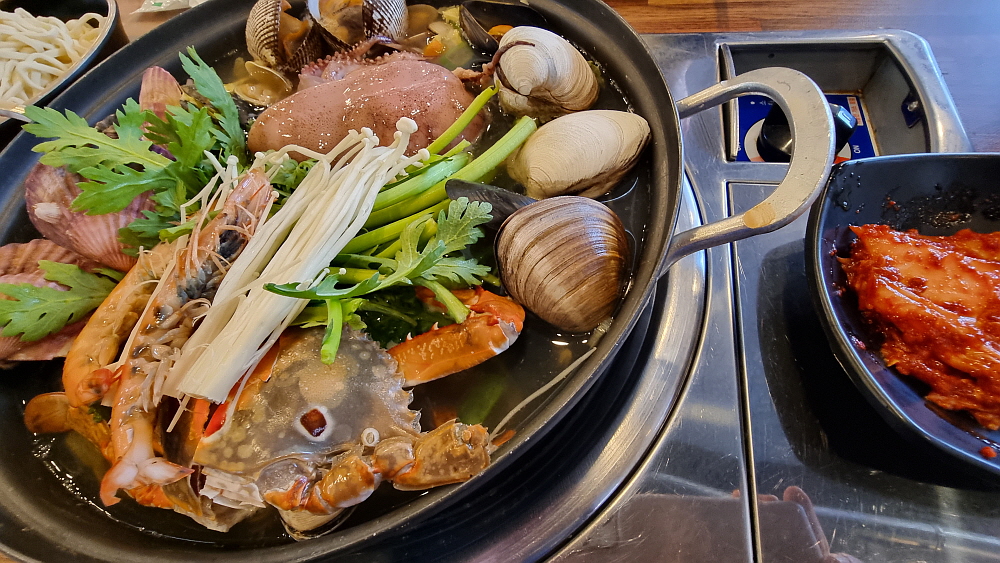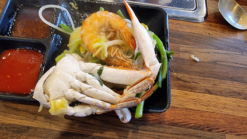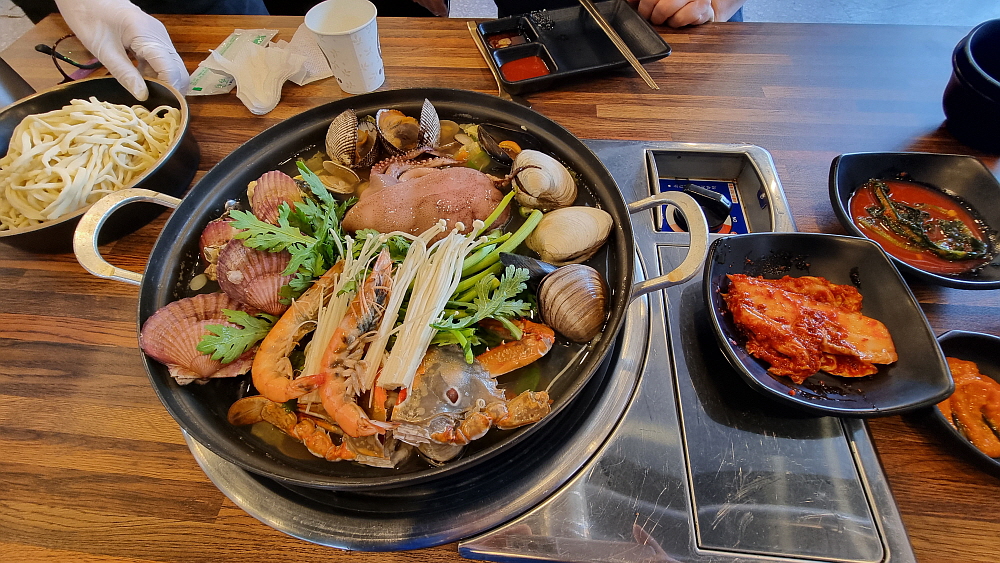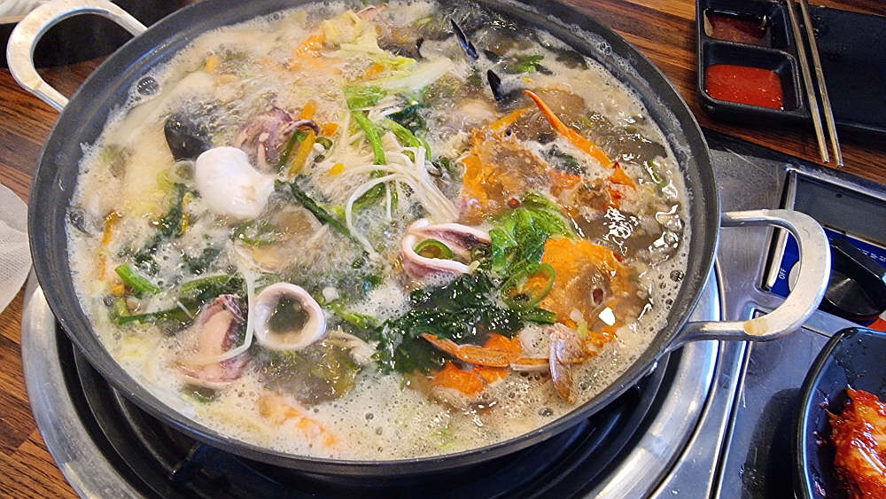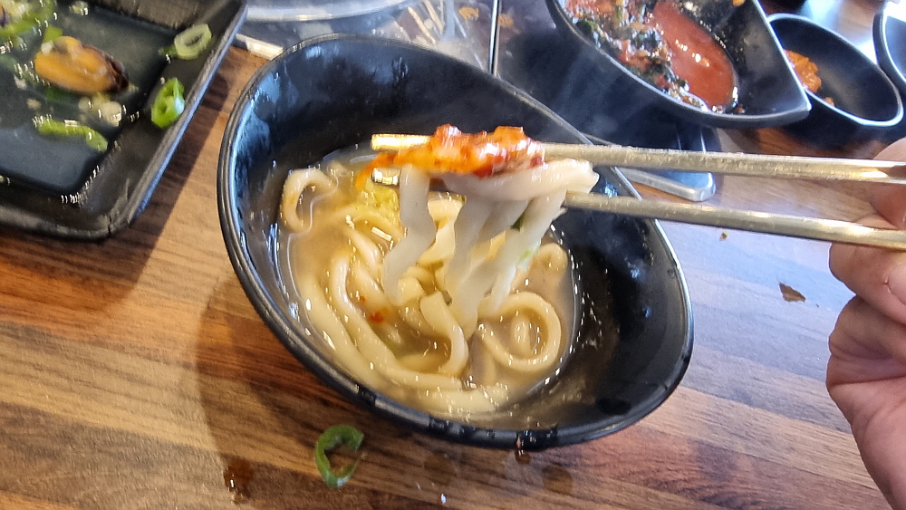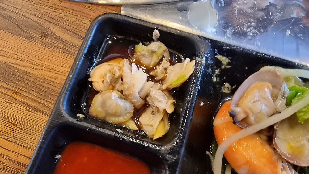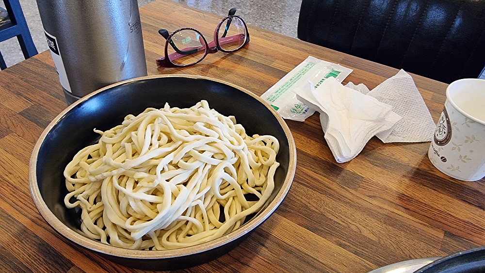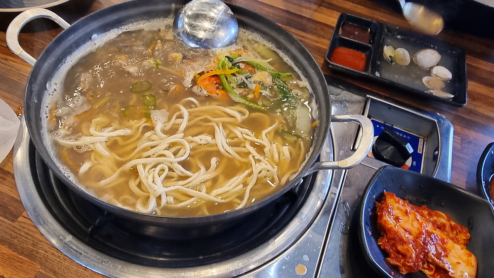 문어는 없지만 그래도 엄청 푸짐한 해물이 들어간 칼국수가 나왔다. 어느 정도 익힌 뒤에 손님에게 가지고 오지만 그래도 완전히 해물 맛이 나게 하려면 상당 시간을 끓여야 했다. 여러 종류의 조개가 나왔고, 특히 가리비가 많이 들었다. 해물은 별 간 없이 그냥 푹 끓이기만 해도 국물이 정말 진해진다. 시간이 좀 걸리더라도 해물들에서 국물이 우러나도록 기다려야 했다. 그리고 생면이 같이 나왔는데 두툼한 면발을 보니 저 면도 익히는데 10분 이상은 끓여야 할 것 같았다. 먼저 해물들을 먹고 나서 그 국물에 칼국수를 삶아 먹으면 되는 것이다.