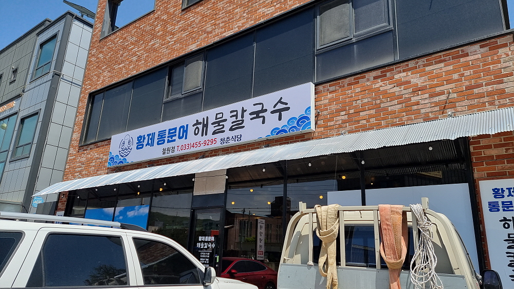 몇 번이고 철원을 왔다 갔다 하지만 계속 먹게 되는 것이 바로 해물 칼국수다. 여긴 내륙 중에 내륙이고 전방 지역임에도 해물칼국수 집이 많은 것은 왜일까? 내륙에 사니까 해물이 그리운 걸까? 아무튼 신철원 입구에서도 맛난 해물칼국수를 먹은적이 있는데 이번엔 동송에서 진한 바다 내음의 해물칼국수를 먹게 되었다. 원래 계획은 동송에 많은 막국수를 먹으러 가는 길이었는데 갑자기 식당이 없어져 버린 까닭에 허탈한 마음으로 돌아가다가 이집을 발견했다. 철원처럼 군사 도시는 말하자면 소비 도시라 할 수 있다. 그래서 인구에 비해 의외로 새로운 식당들이 많이 눈에 띈다.