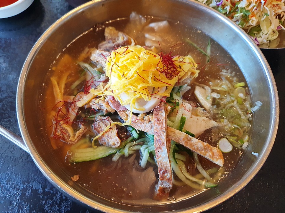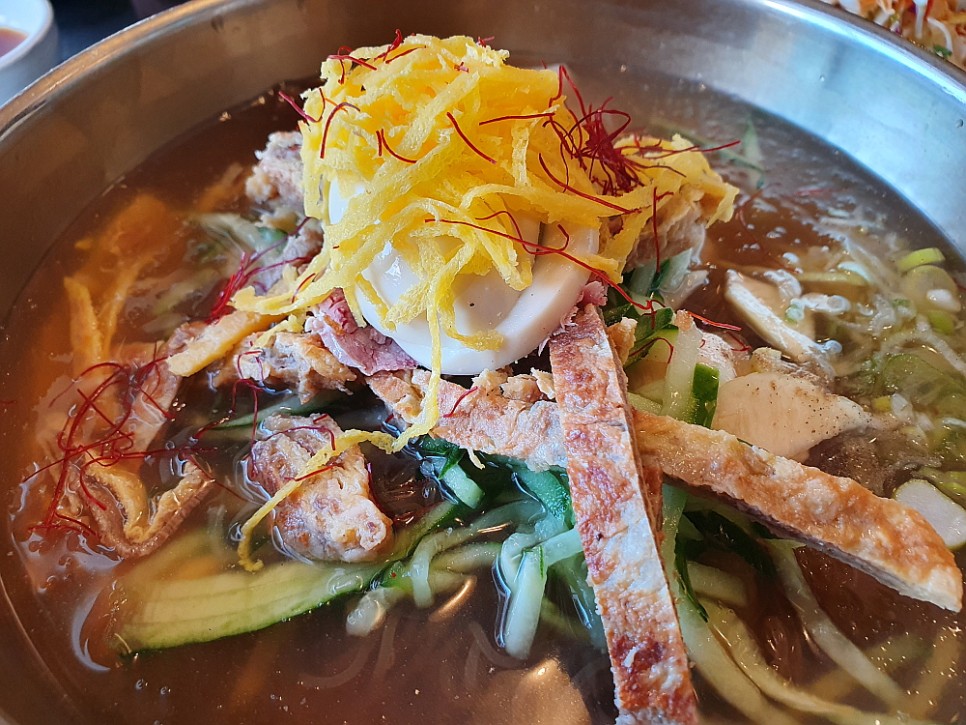 반찬식으로 함께 나온 육개장 비슷한 국물을 먹고 있노라면 드디어 우리가 주문한 냉면이 나왔다. 처음 비주얼은 역시나 고명이 많고 화려했다. 하지만 아주 탄식이 나올 정도는 아니었다. 특이한 것은 국물 뿐 아니라 육전이 냉면에도 들어간다는 것이다. 이럴 줄 알았다면 육전을 주문하지 않아도 될 것을... 이것 저것 분명 우리가 먹던 냉면에서는 보기 드문 재료들이 많이 들어가 있었다. 계란 지단도 그 중 하나였다. 당연히 정성이 느껴지고, 푸짐하다는 생각이 들었다. 강렬하게 붉은 빛의 비빔냉면은 좀 부담스러웠지만 역시 냉면의 지존격인 물 냉면은 포스가 느껴지는 좋은 모습이었다.