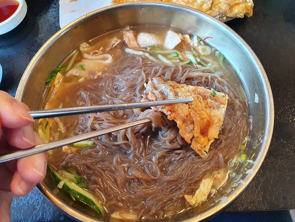 생선으로 육수를 만들었기에 분명 뒤끝에 살짝 생선맛이 감도는 잘 만든 육수였다. 특이하고, 색다른 것이 분명 진주 냉면의 뭔가 다른 길을 느끼게 해주는 맛이었다. 하지만 면이 좀 뭐랄까 기대와 달리 그냥 보통의 맛이었다. 마치 공장에서 파는 것 같이 너무나 스탠다드 하다고 해야할까? 보통 냉면 고수들은 면도 메밀 특유의 향과 식감이 나오기 마련인데 그런 메밀를 잘 다루는 장인의 포스가 느껴지는 특별한 맛은 아니었다. 평범하다고 해야 할 것이다. 그 점이 좀 아쉬웠다. 분명 맛있는 냉면임에는 틀림없지만 대단하다는 생각이 들 정도는 아니었다고 해야겠다.