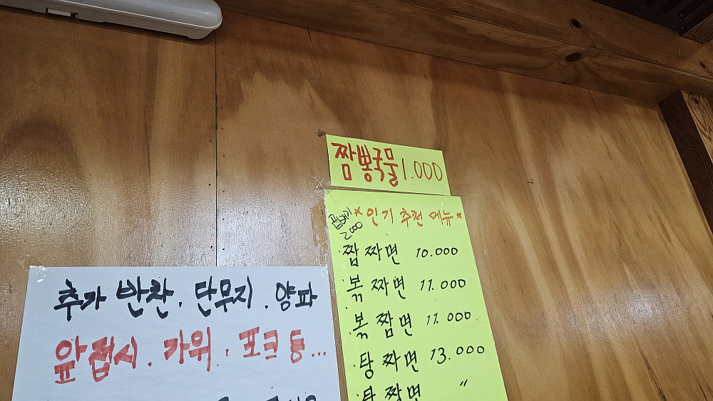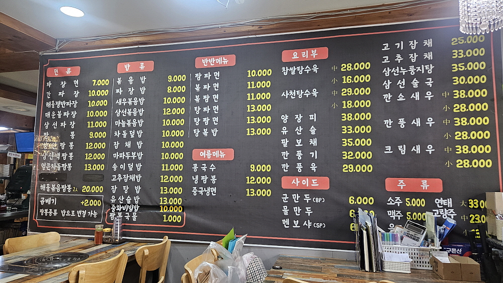 가게 이름은 '찐짱뽕 짜장'이다. 그런데 우린 짬뽕이 아니라 둘 다 삼선짜장을 주문했다. 중국집 하면 아직도 다른 어떤 메뉴보다 짜장면이 먹고 싶다. 그것도 뭔가 특별하고, 더 고급져 보이는 간짜장이나 삼선짜장을 먹고 싶다. 삼선이라는 말이 꼭 세 가지 재료를 넣는 것이 아니라 더 고급스럽고, 신선한 재료를 넣어 만든다는 의미란다. 가게의 실내 구조가 좀 특이했는데 입구는 좁고, 안으로는 넓은 홀이었다. 처음 들어갈 때는 몰랐는데 식당 안으로는 제법 많은 손님들이 식사를 하고 있었다. 추가 반찬도 셀프로 먹을 수 있고, 양도 넉넉하고 특이하게도 짬뽕 국물만도 1,000원에 주문할 수 있는 곳이었다.