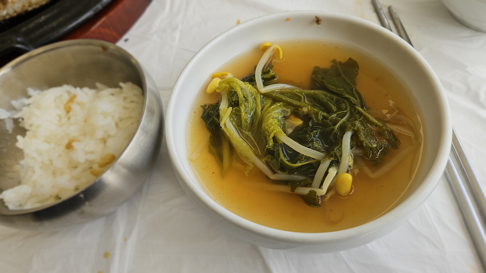 반찬이 본인이 얼마든지 갖다 먹을 수 있는 셀프시스템이다. 가격이 착한 편인데도 밥은 솥밥이다. 상당히 반가운 일이다. 솥밥은 뭔가 정성이 훨씬 더 들어간 것 같은 밥 아닌가? 된장국을 내어주는데 생선구이는 꼭 국이 있어야 먹는 맛이 있다. 그런데 신기할 정도로 자극적이지 않았다. 말 그대로 집에서 그냥 만든 반찬과 국 같았다. 좋은 느낌이긴 한데 뭐랄까 식당이라면 조금은 조미료와 간간한 맛이 나야 하는 법인데 이렇게 자연스럽게 조미료나 간을 넣지 않은 집은 못 본 것 같다. 생선을 주문을 받고 굽는 시스템인지 나오는데까지 시간은 좀 걸렸다.