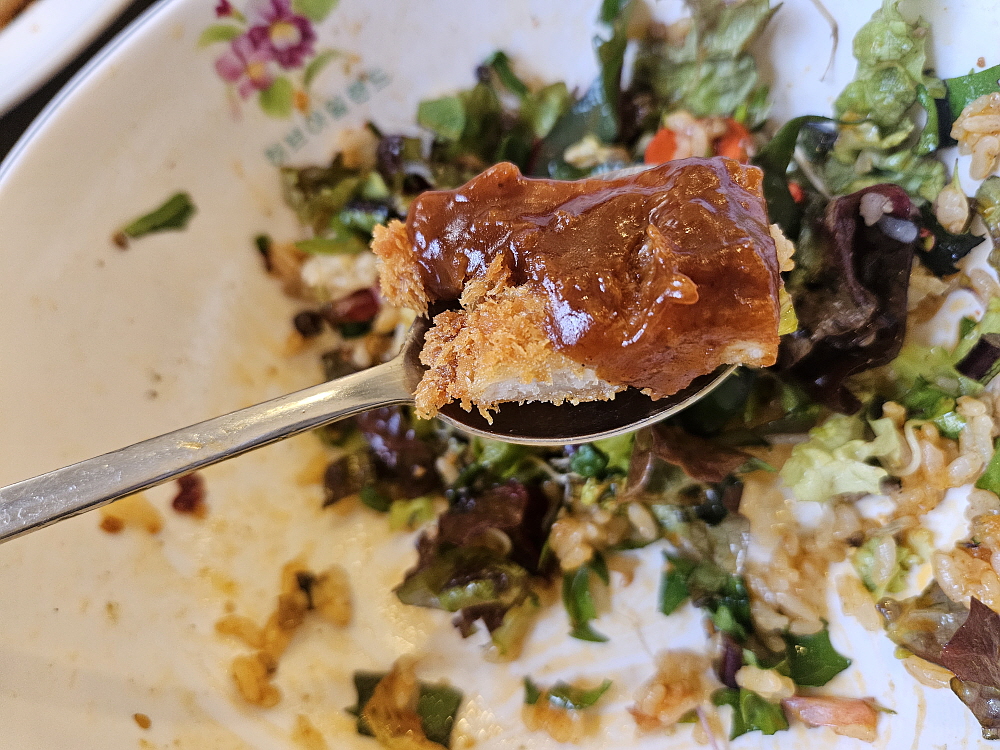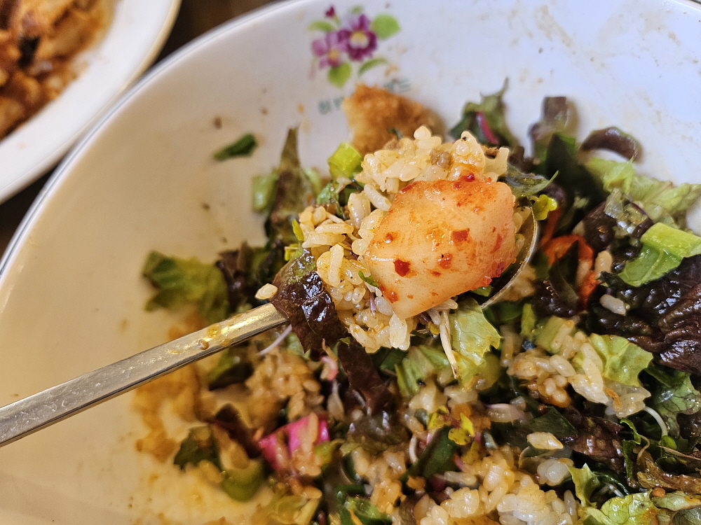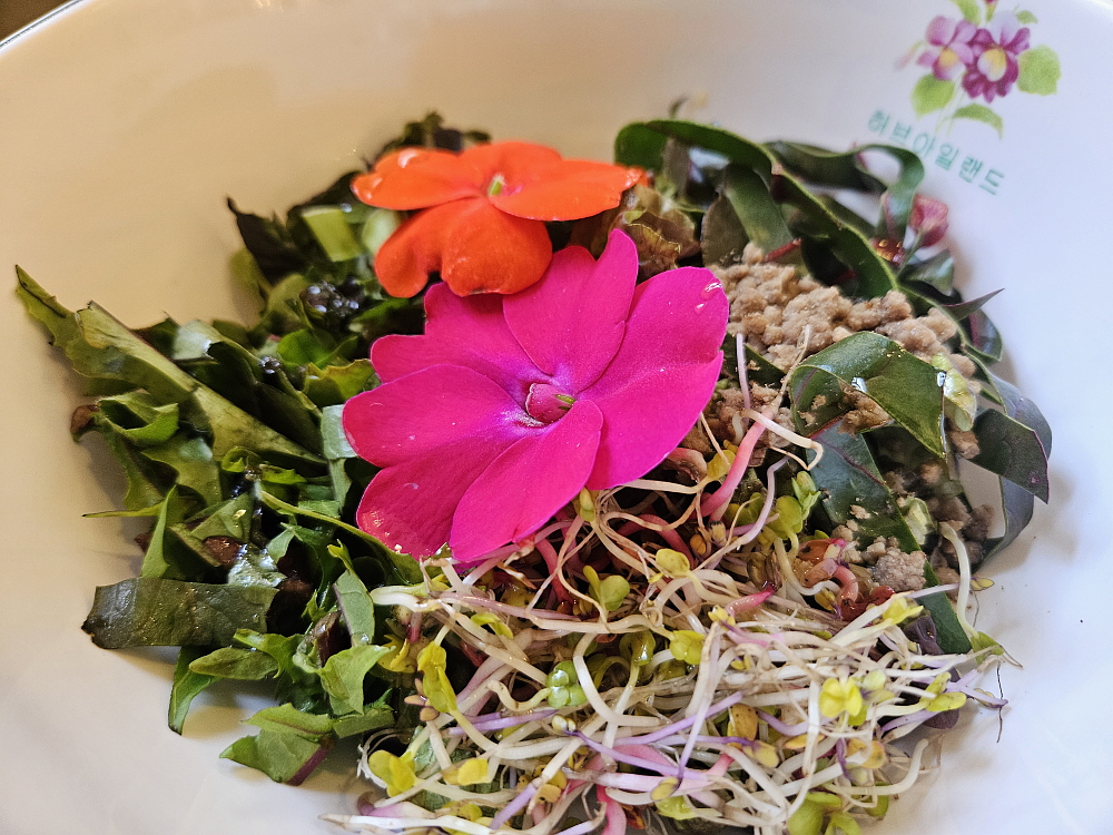 어김없이 이날도 허브 비빔밥과 반찬처럼 돈가스가 함께 나왔다. 개인적으로 시골 출신이지만 이렇게 꽃잎을 먹어도 되나 싶은 생각이 들 정도로 너무나 야생의 느낌 그대로의 꽃과 잎들이 음식 그릇 안에 들어가 있다. 신선하고, 예쁘다는 느낌이 있긴 하나 평소 먹어보지 못하는 음식인지라 신기하기도 했다. 이렇게 그림처럼 예쁜 꽃과 야채를 밥과 잘 비벼 먹으면 되는 것이다. 가격은 13,000원이다. 비싼 것인지 싼 것인지 가늠이 안 된다. 하지만 분명한 것은 이런 비빔밥은 어디서도 먹기 힘들다는 것이다. 이곳의 시그니쳐 메뉴이자 유니크한 아이템이라 하겠다.