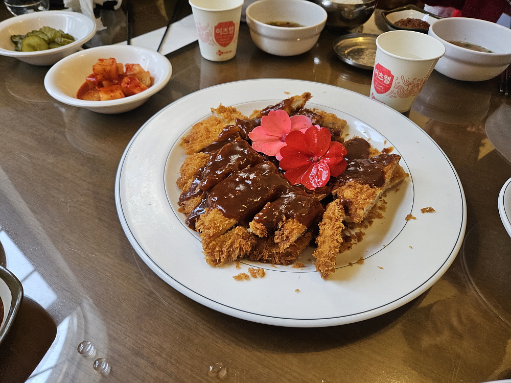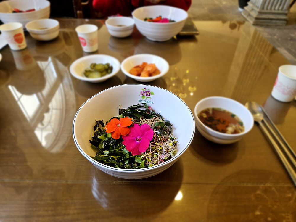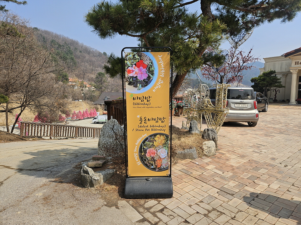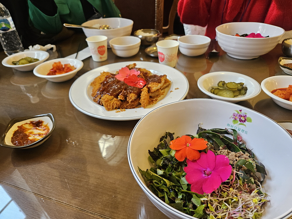 가만히 보니 반찬으로 나온 돈가스 위에도 강렬한 붉은 빛의 꽃잎이 있다. 과연 허브 아일랜드 답다. 식물의 고향이 여기인가 보다. 물론 규모가 워낙 크기 때문에 아마도 이곳 주방은 이런식으로 돈가스나 비빔밥을 만들어 내주는 경험이 엄청 많을 것이다. 그렇게 내공이 쌓인 주방 직원들의 솜씨 덕분에 돈가스의 맛은 아주 훌륭했다. 맛있는 돈가스의 기준이 겉바속촉이라면 바로 그런 기준에 아주 잘 부합되는 돈가스라 하겠다. 허브 아일랜드를 돌아다니느라 허기진 배를 채우기 위해 서둘러 밥을 비비고 비빔밥을 먹어 보았다.