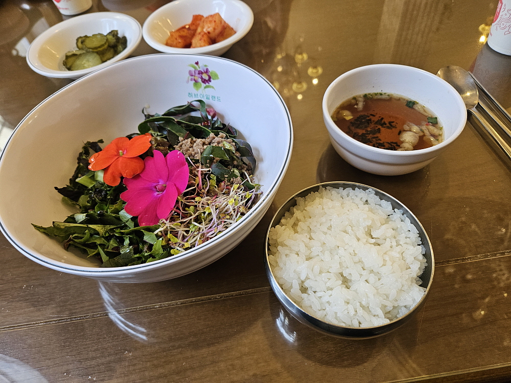 가만히 보니 반찬으로 나온 돈가스 위에도 강렬한 붉은 빛의 꽃잎이 있다. 과연 허브 아일랜드 답다. 식물의 고향이 여기인가 보다. 물론 규모가 워낙 크기 때문에 아마도 이곳 주방은 이런식으로 돈가스나 비빔밥을 만들어 내주는 경험이 엄청 많을 것이다. 그렇게 내공이 쌓인 주방 직원들의 솜씨 덕분에 돈가스의 맛은 아주 훌륭했다. 맛있는 돈가스의 기준이 겉바속촉이라면 바로 그런 기준에 아주 잘 부합되는 돈가스라 하겠다. 허브 아일랜드를 돌아다니느라 허기진 배를 채우기 위해 서둘러 밥을 비비고 비빔밥을 먹어 보았다.
