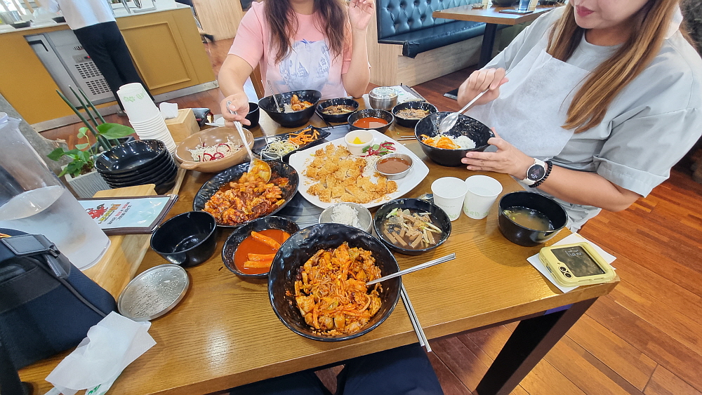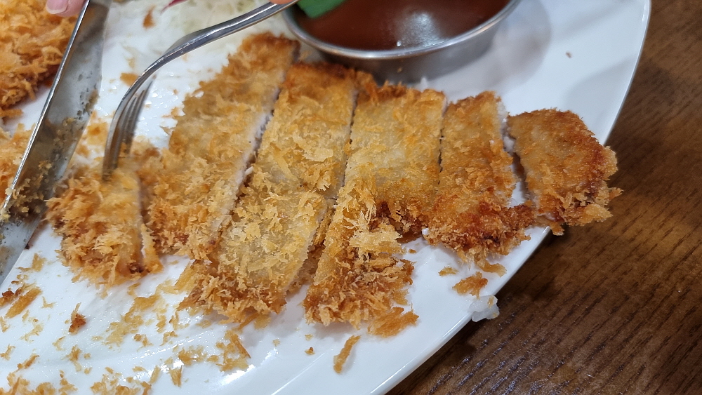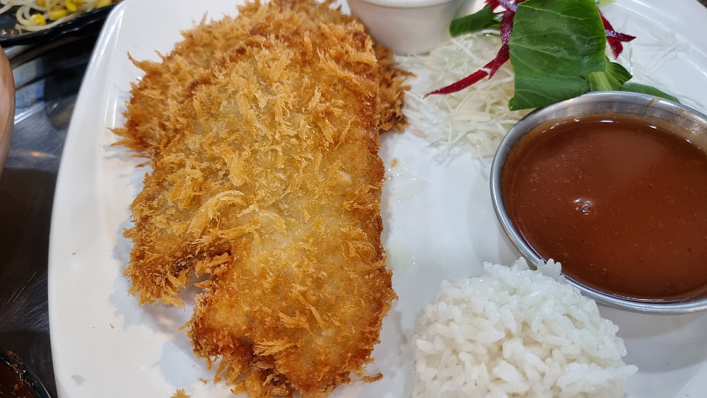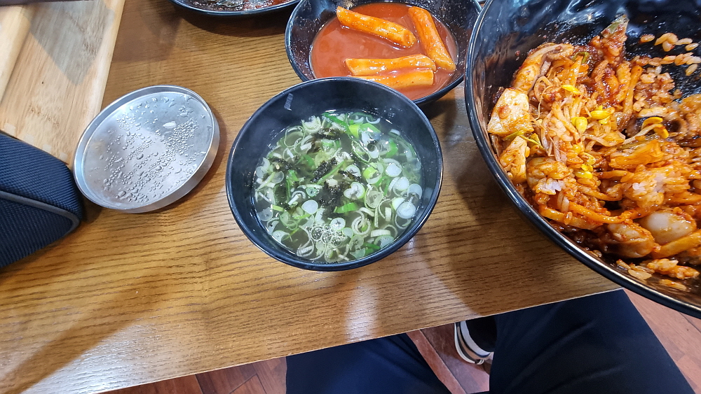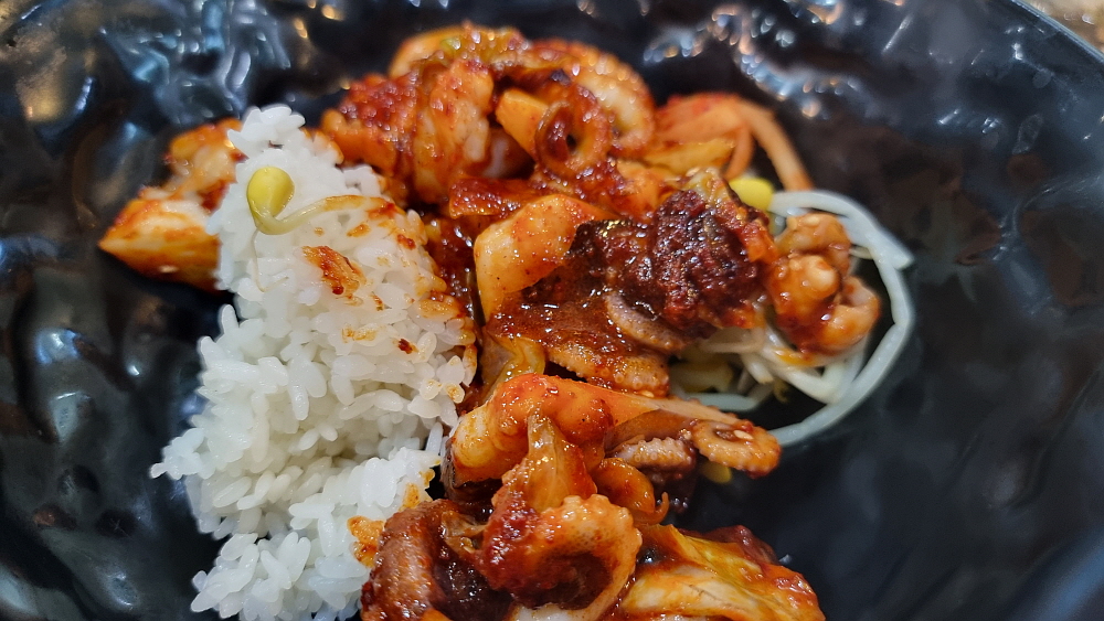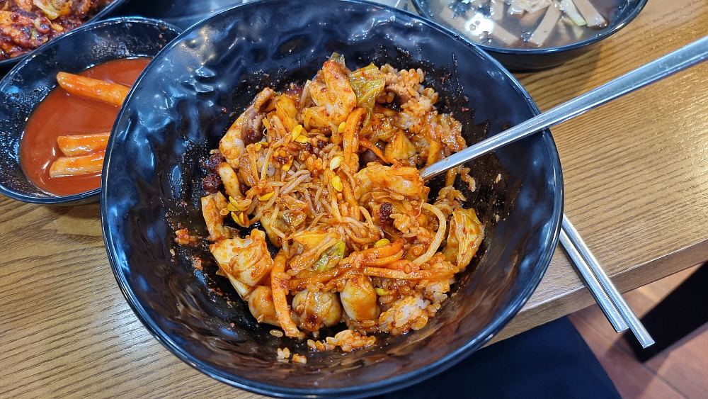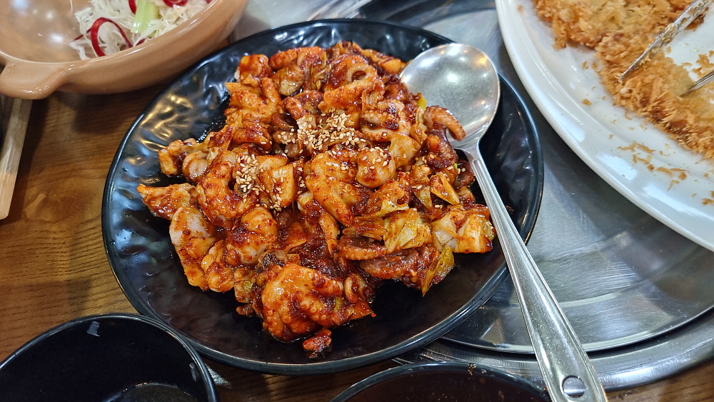 메뉴도 거의 그대로인데 돈까스라는 메뉴가 있었는지는 잘 기억이 나지 않는다. 우리는 쭈꾸미와 돈가스를 주문했다. 가장 먼저 묵사발을 갖다 주는 것도 변함이 없었다. 간단하게 국수나 떡볶이로 속을 달래고 있다 보면 매운 양념의 쭈꾸미가 나온다. 불향이 나는 매운 쭈꾸미를 밥에 넣고 콩나물과 무김치 같은 것을 섞어 잘 비벼 먹으면 이집의 시그니쳐 쭈꾸미 정식이 되는 것이다. 돈가스는 어디서나 볼법한 그런 평범한 비주얼이었고, 맛고 소~소~ 였다. 매운 쭈꾸미를 먹고 기름지면서 고소한 돈가스를 한 점 집어 먹으면 이것도 꽤 괜찮은 조합인 것 같다.