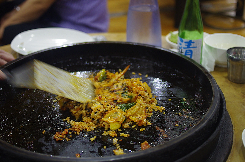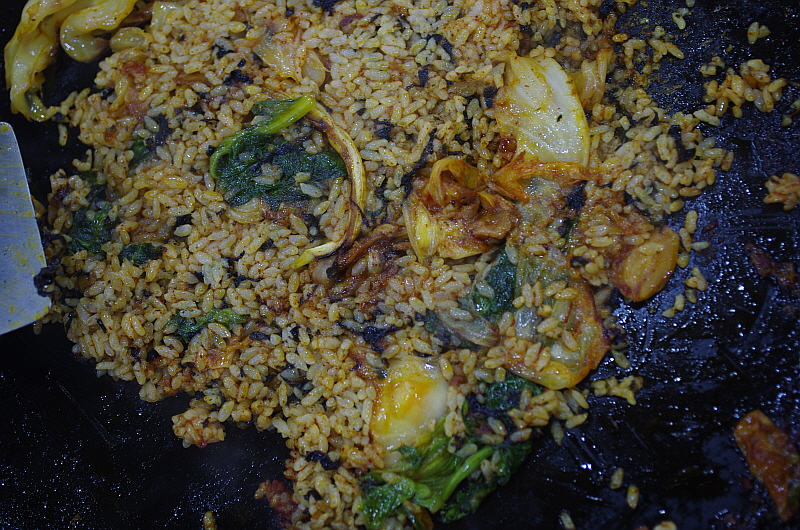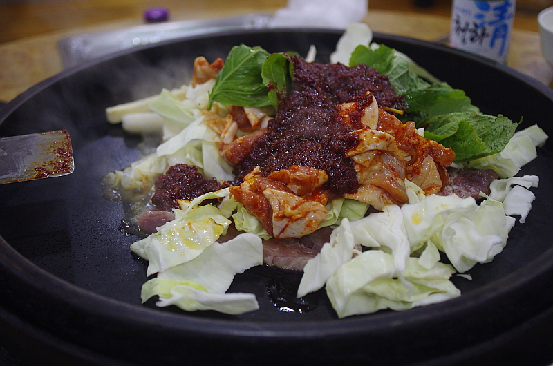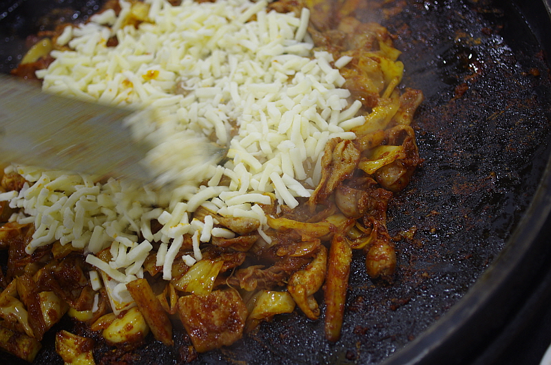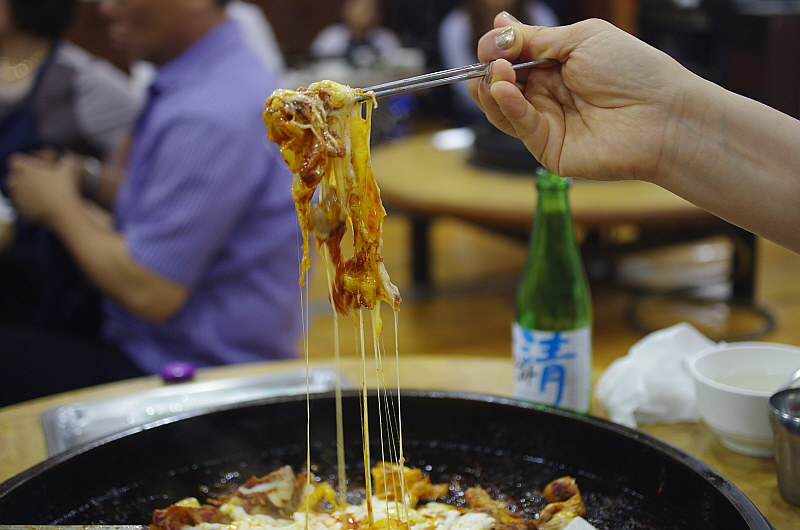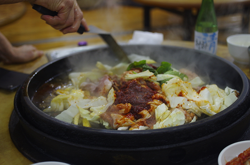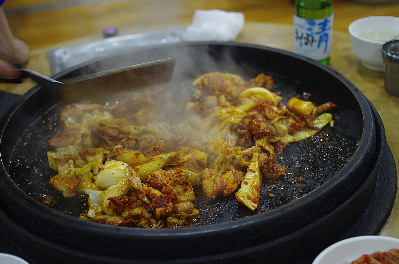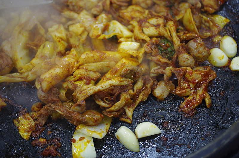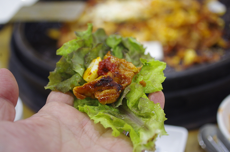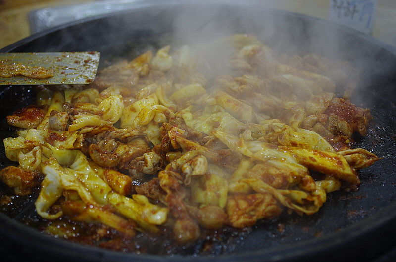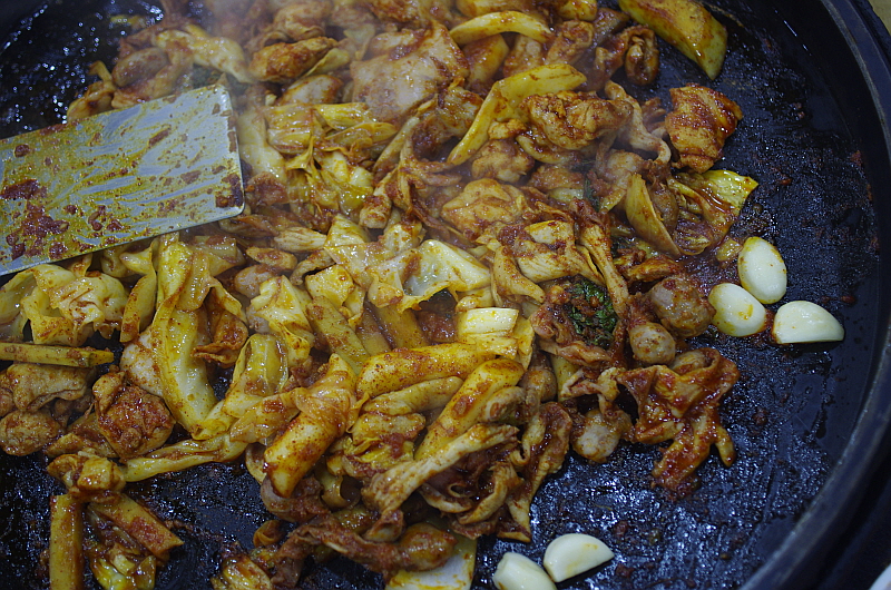 어느 정도 닭갈비가 익어간다 싶으면 일하는 아주머니 아니 할머니들이 가끔 들러 휘휘 닭갈비들을 뒤집어 주었다. 떡은 금방 익지만 닭고기는 아무래도 20분 이상은 걸려야 먹을 수 있는 것 같았다. 배도 고프고 얼른 맛을 보고 싶다는 생각에 우린 떡이나 양배추 같이 먼저 익는 것들을 쉴새없이 먹었다. 한가지 아쉬운 것은 닭내장이었는데 왜 다른 테이블에서 그것을 잘 주문하지 않는지 먹고 나서야 알 수 있었다. 아무래도 주문양이 많지 않은지 냉동된 내장을 해동하여 주는 것 같았는데 그러다 보니 야들야들한 식감도 없고, 약간 닭비린내도 났다.