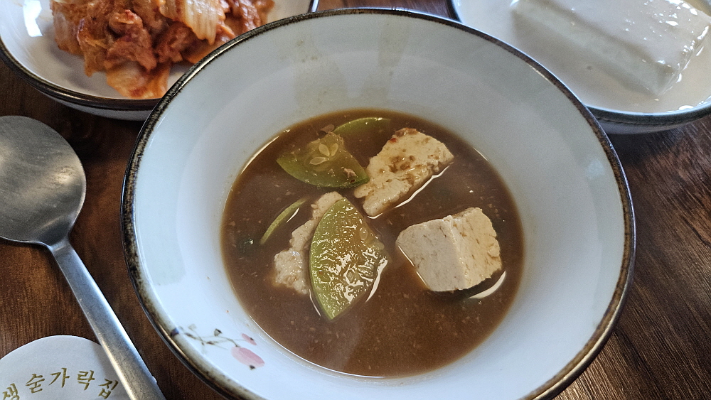 여러 반찬들이 나오기는 했지만 역시 여기는 두부에 진심인 곳이었다. 전체적으로 두부가 부드럽고, 잡내가 없는 아주 깔끔한 맛이었는데 고소함도 진하게 있었다. 두부 하나만 있어도 훌륭한 반찬이 된다는 것은 한국 사람이면 누구나 아는 일이다. 반찬들도 자연스러운 맛이었기 때문에 맘에 들었다. 요즘 보기 드문 도라지 나물이 아주 좋았다. 된장찌개도 조미료 맛이 거의 나지 않는 자연스러운 것이었다. 일행들은 모두 반찬을 남김없이 먹었다. 고등어 구이는 최근 통풍 때문에 먹지 못하던 것이라 몇 젖가락만 집어 먹었을 뿐인데 그 맛이 아주 훌륭했다.