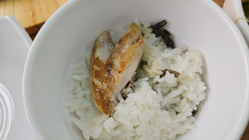 소 사이즈라 해도 네 가지 종류의 생선이 구워져 나왔다. 가장 맘에 드는 것은 아무래도 국민생선이라는 고등어였지만 열기나 가자미도 맛이 좋았다. 반건조 생선을 사용하여 굽는지 생선의 살이 단단하고, 딱딱한 편이었다. 하긴 생물 생선은 다루기도 어렵고, 굽다 보면 살이 다 부서지기 마련이다. 그리고 생선을 반건조했을 때 그 맛이 더 강하게 난다. 맛이 더 농축된다고 해야할까? 다만 이빨이 시원치 않은 노인들이나 애들은 조심해서 먹어야 할 것이다. 생선구이와 된장국, 그리고 하얀 쌀의 솥밥은 정말 궁합이 잘 맞는다. 솥밥을 좋아하는 사람들은 솥밥을 이용해 만들어 먹는 누룽지의 맛을 뿌리치기 어려울 것이다.