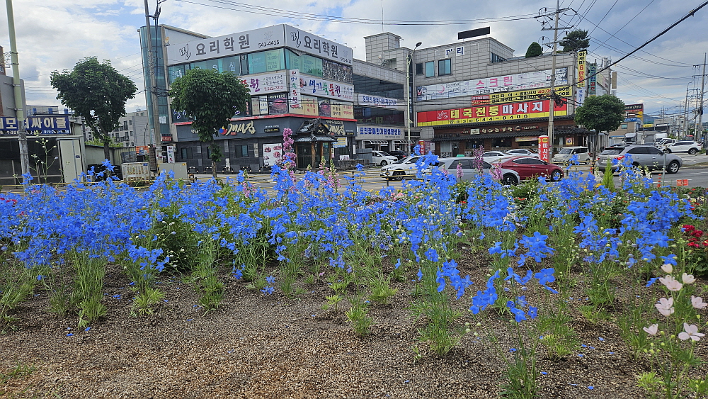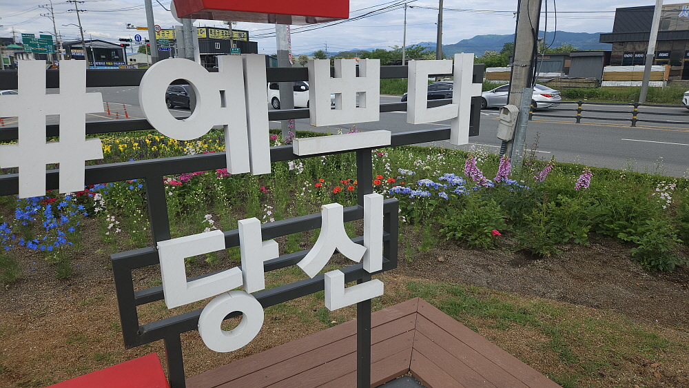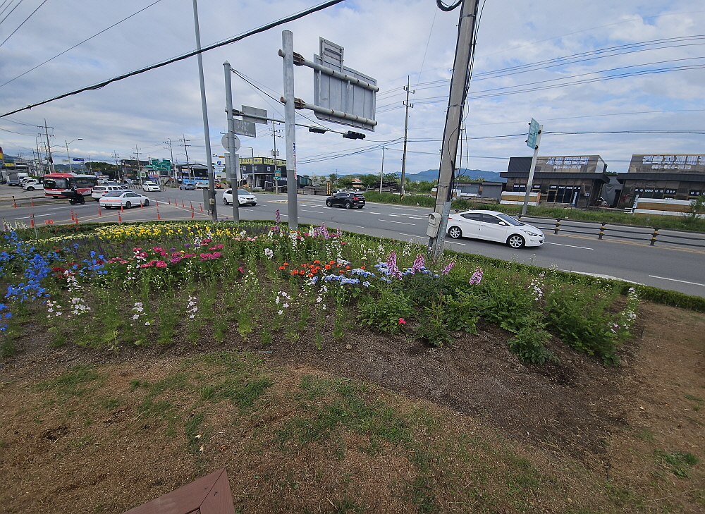 그러나 너무나 눈부신 꽃밭 앞에서 사진 한 장 남기고 싶은 마음은 인지상정이다. 나도 모르게 발걸음은 그곳으로 향했다. 이날은 마침 작은 여유가 허락되어, 멀찌감치 차를 세우고 그 안으로 들어가 보았다. 멀리서 보라고 만든 공간이라지만, 뜻밖에도 소박한 포토존과 잠시 기댈 수 있는 자리도 마련되어 있었다. 수많은 차들이 바쁘게 오가는 길목이라서 더욱 세심한 손길이 닿은 것 같았다. 계절마다 꽃의 옷이 바뀌고, 조경 또한 조금씩 새로운 얼굴을 내미는 듯 했다. 어느 해인가 탐스러운 튤립이 봉오리를 보았던 기억도 선명하다. 올해는 들꽃처럼 보이는 소박하지만 어여쁜 친구들이 자리를 지키고 있다. 식물에 문외한이라 꽃들의 이름은 알 수 없지만, 화려하지 않아도 곱게 어우러지는 모습은 가슴에 작은 파동을 일으킨다. 잠시 그 자리에 머물러 사진 속에 이 아름다움을 담아보았다.