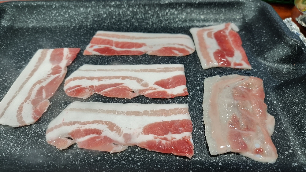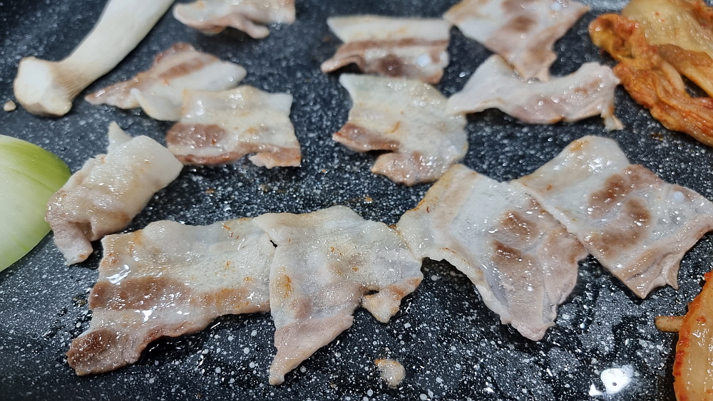 대패삼겹살의 또 다른 장점은 빨리 익는다는 것이다. 그리고 기름이 적당히 나온다는 점이다. 기름이 나와야 그렇게 좋아하는 김치를 함께 구울 수 있다. 야채도 구울 수 있다. 익는 시간이 빠르니 손 급한 술꾼들도 몇 점 먹으면서 술잔을 기울일 수 있다. 처음엔 기름이 거의 나오지 않더니 어느 정도 굽다보니 적당하다 할 정도의 기름이 나왔다. 이런 맛이 삼겹살을 먹는 진정한 맛이라 하겠다. 일부러 생 삼겹살을 얼려서 대패로 만든 것인지 몰라도 고기의 상태는 아주 좋았다. 빛깔도, 냄새도 아주 신선해 보였다.