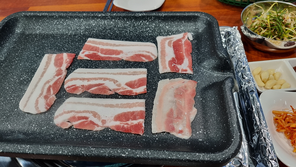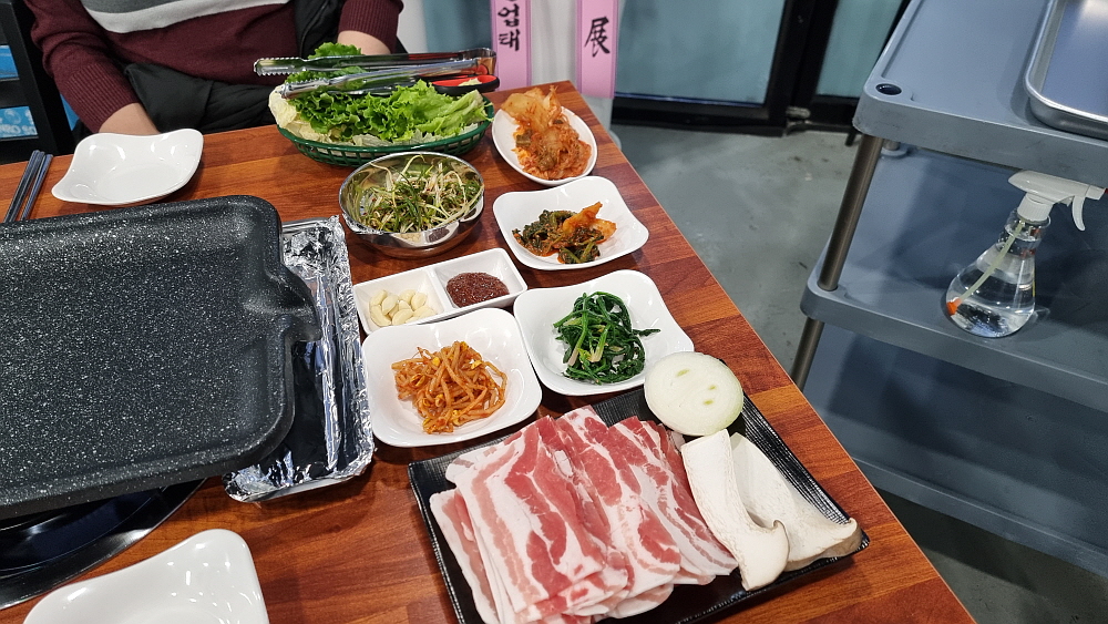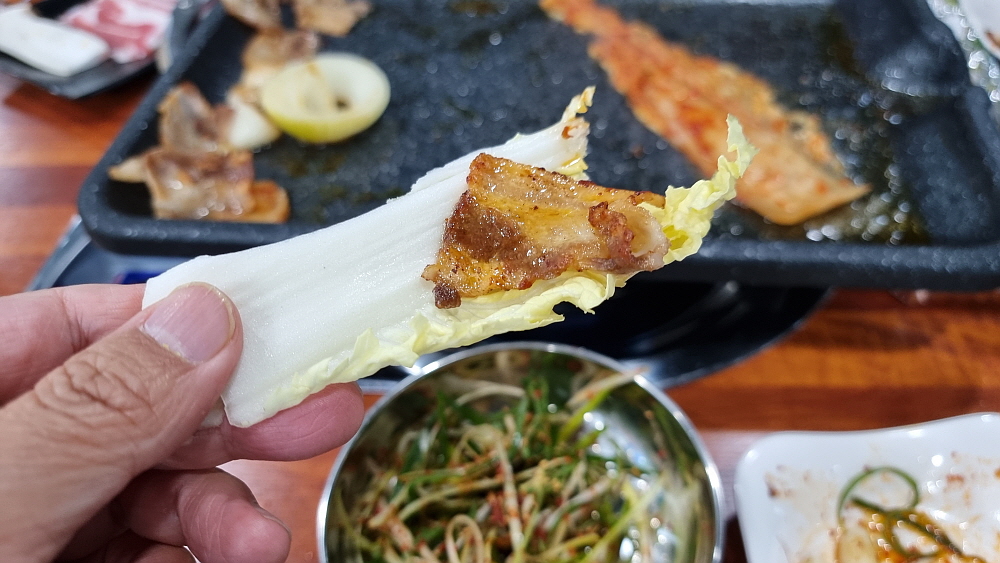 개인적으로 생삼겹살보다 냉 삼겹살을 더 즐기는 편이다. 이집의 메뉴판에 있는 대패 삼겹살은 아마도 냉동을 의미하는 것일 것이다. 그래서 우린 대패삼겹살을 주문했다. 맛난 냉 삼겹살은 아이스크림처럼 빛깔이 영롱하고 입에서 살살 녹는 식감이다. 이집의 대패삼겹살은 그런 의미에서 원했던 그런 비주얼과 맛이었다. 커다란 돌판에 불을 지피고 그 위에 삼겹살을 놓은 행위는 어쩌면 가장 신성한 저녁 식사 준비 예절일 수 있다. 대부분이 삼겹살 집들이 고기는 잘 나오지만 반찬이 부실 한 것과 비교하면 이집은 백반집처럼 반찬도 많이 나온다.