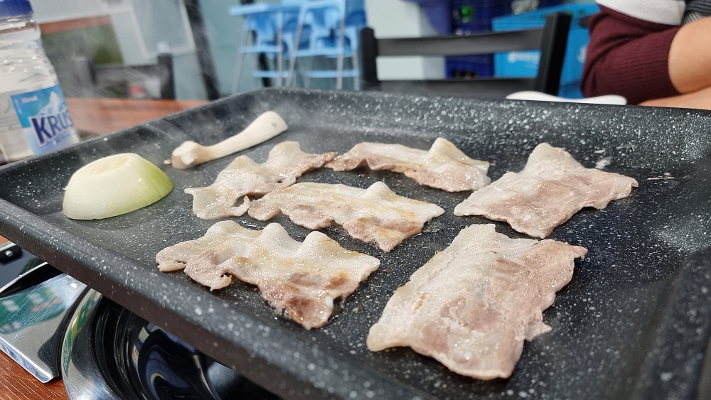 대패삼겹살의 또 다른 장점은 빨리 익는다는 것이다. 그리고 기름이 적당히 나온다는 점이다. 기름이 나와야 그렇게 좋아하는 김치를 함께 구울 수 있다. 야채도 구울 수 있다. 익는 시간이 빠르니 손 급한 술꾼들도 몇 점 먹으면서 술잔을 기울일 수 있다. 처음엔 기름이 거의 나오지 않더니 어느 정도 굽다보니 적당하다 할 정도의 기름이 나왔다. 이런 맛이 삼겹살을 먹는 진정한 맛이라 하겠다. 일부러 생 삼겹살을 얼려서 대패로 만든 것인지 몰라도 고기의 상태는 아주 좋았다. 빛깔도, 냄새도 아주 신선해 보였다.