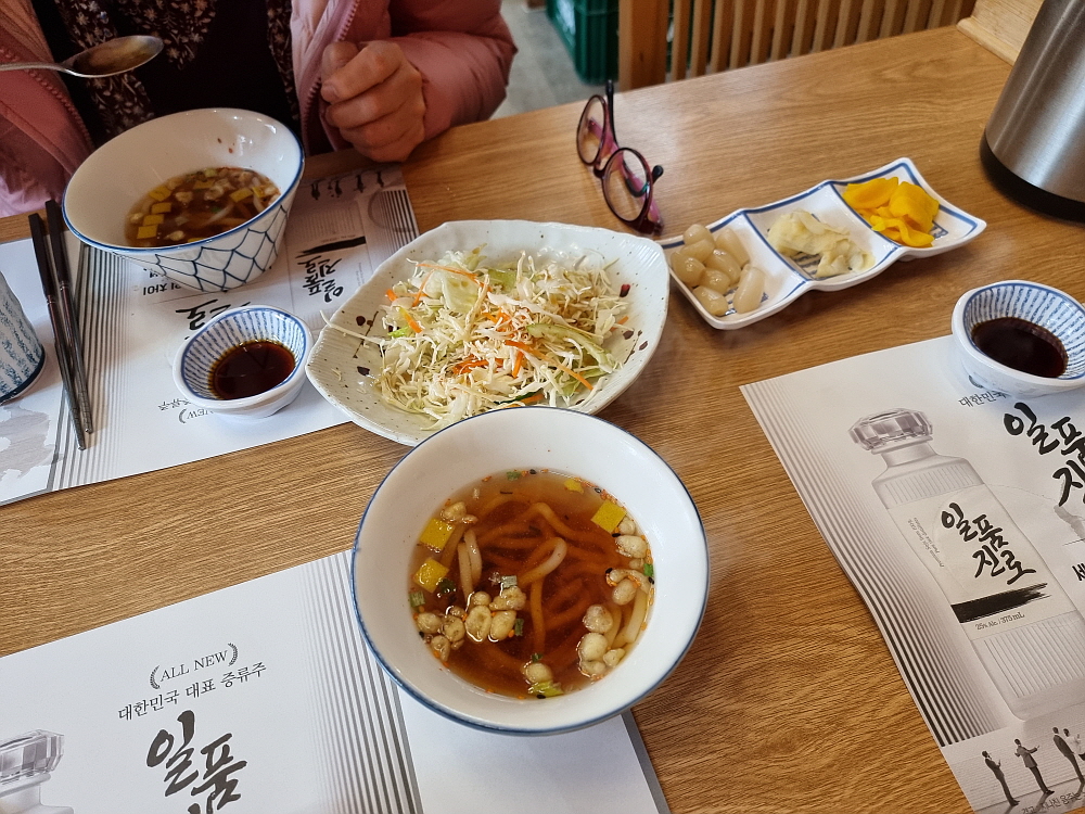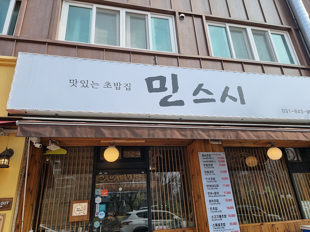 동오마을 먹자골목의 외곽쪽에 이 스시집이 있다. 이름하여 '민스시'이다. 밖에서 봤을 때는 투다리 같은 선술집 분위기였다. 하지만 막상 들어오니 그렇게 작은 크기의 식당은 아니었고, 분위기도 정통 스시집과 크게 다르지 않은 것이었다. 역시 선입견과 실제 모습은 차이가 있다. 점심 때 방문한 이곳에서 우리는 점심 특선이 아니라 그냥 모듬초밥을 주문했다. 일 인분에 13,000원 짜리 스시 10개가 나오는 세트이다. 여기에 작은 우동과 막기도 나온다. 가성비는 좋은 편이다.