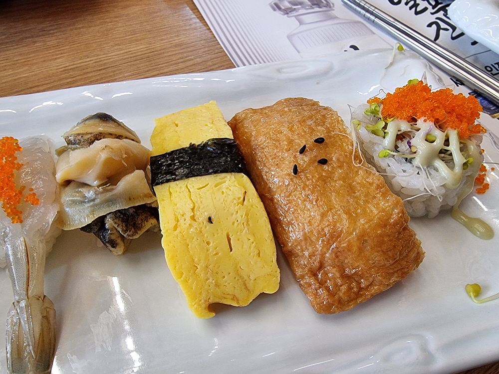 이 모듬 스시보다 조금 돈을 더 내면 생선으로 구성된 정통 스시도 먹을 수 있다. 하지만 이날은 이 정도로 만족하기로 했다. 일단 이집의 맛을 먼저 봐야겠기에 노멀한 구성이 더 필요했다. 전체적으로 색감이나 비주얼, 그리고 크기는 괜찮았다. 밥 양이 많지 않아 먹기에 부담도 없었다. 맛도 아주 훌륭했다. 스시는 재료와 초밥의 조화가 가장 중요한데 과하지도 덜하지도 않은 제대로 된 스시 맞았다. 동네 골목에 있는 스시집이라 하기엔 주인장의 솜씨가 예사롭지 않았다. 보통 자랑삼아 자기가 어디서 일했다던지, 어디서 스시를 배웠다던지 붙여 놓는 집들도 있는데 여긴 그런 정보가 없었다.