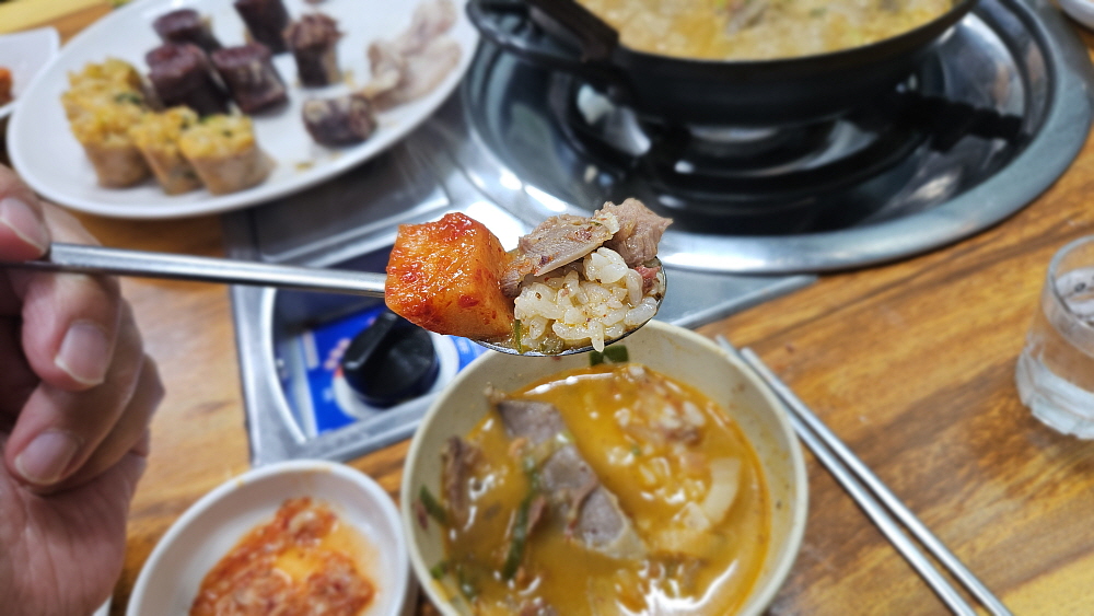 술국은 우리가 흔히 보아왔던 바로 그 비주얼이었다. 돼지 사골을 푹 끓여 내온 국물에 찰순대와 토종순대가 적절히 들어가 있고, 돼지의 부속고기들도 들어 있다. 다소 내용물이 적지 않나 싶은 생각이 들기는 했지만 이 정도면 소주 안주로는 아주 그만이다. 들깨를 미리 넣었는지 국물에서 고소한 맛이 확 올라왔다. 서둘러 내 그릇에 옮겨 담고 정신없이 몇 숟가락을 떠 먹었다. 술보다 먼저 순대를 먹게 되는 것을 보면 어지간히 반갑기는 했는 모양이다. 소주 한 잔을 입에 넣고 순대국을 먹으니 역시 더 맛이 좋았다. 우리는 이런 맛에 국밥을 먹는 모양이다. 입에서도 즐겁고, 속도 든든하고, 심리적으로 이렇게나 안정이 되니 말이다.