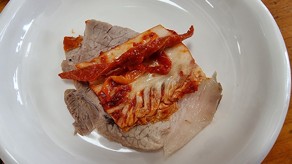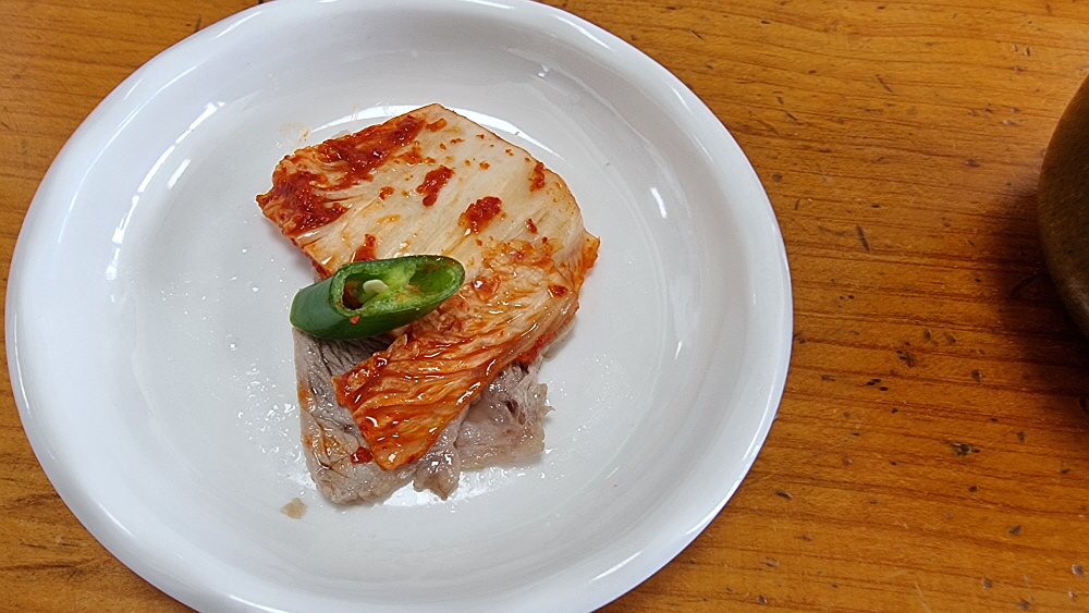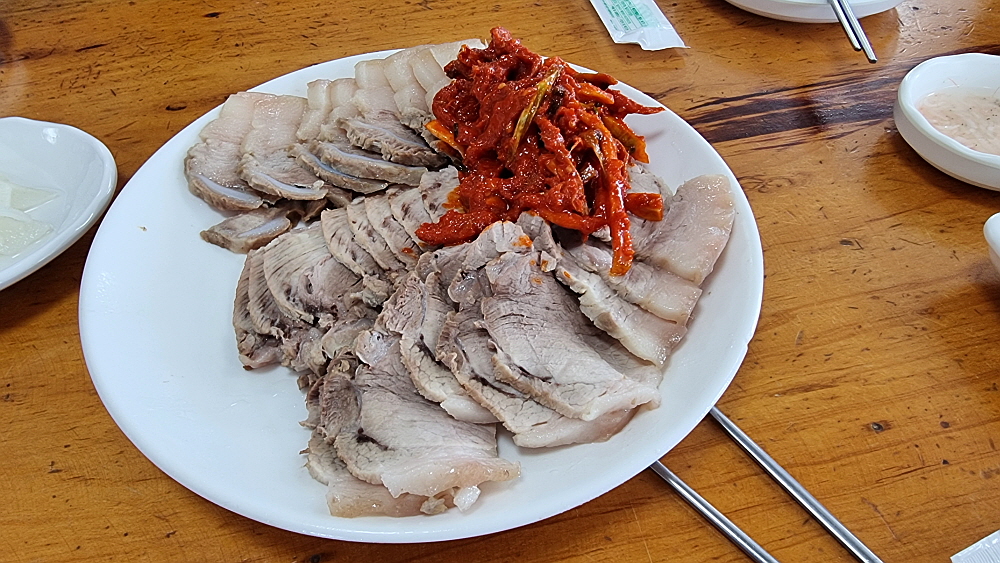주인장은 테이블 별로 비빔을 먹을 것인지, 물을 먹을 것인지 묻고 다녔다. 그리고 잠시 뒤 그 많은 사람들이 주문한 국수들이 나오기 시작했다. 이집은 시스템이 잘 되어 있었던 것이다. 그리고 예약을 하면서 미리 자리마다 수육을 주문해 두었다. 막국수는 바로 만들 수 있지만 수육은 미리 예약을 해야 한단다. 아무래도 고기를 삶는 시간이 필요하니 당연한 일이다. 돼지고기 수육과 막국수는 정말 잘 어울리는 한 쌍이다. 여기에 그 지역의 유명한 막걸리가 곁들여지면 완전 게임은 끝난 것이다. 이날 우리가 그랬다. 바로 삶아 야들야들 뜨끈한 수육과 시원한 막걸리, 그리고 마무리 막국수까지 완벽했다.