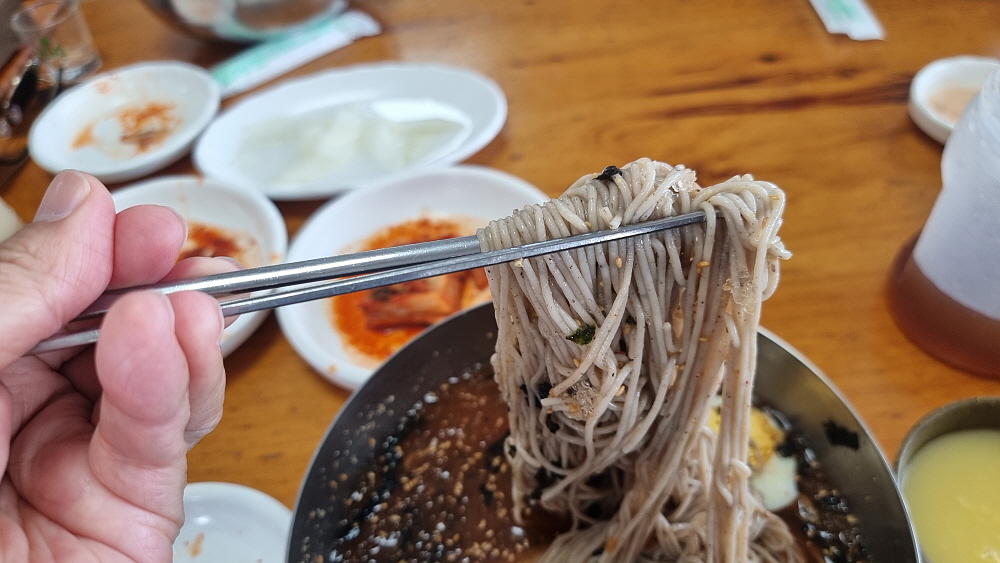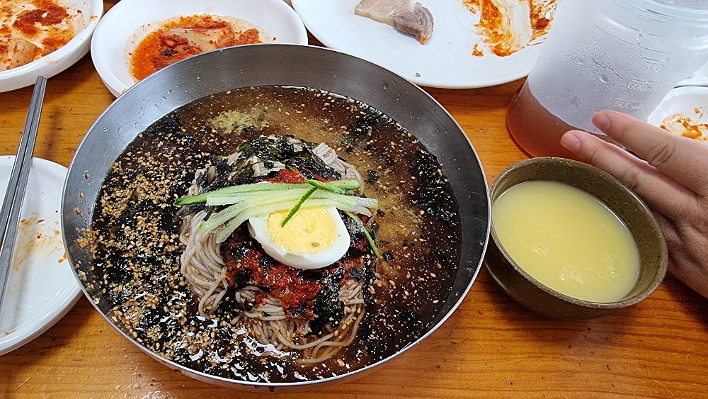메일의 함량이 높은 이집 막국수는 말 그대로 툭툭 끊어지는 찰기없는 면발이다. 글루텐이 듬뿍 들어간 죽죽 늘어나는 면을 생각하는 사람에겐 조금 실망일 수 있다. 하지만 건강한 맛을 찾는 사람이라면 이곳에서 만족스러울 것이다. 간장베이스로 만든 육수는 고기맛도 조금 나고, 간장맛도 어우러지는 특이한 레시피를 자랑한다. 이런 육수 비법을 배울 수 있다면 당장 직장을 때려치고 막국수 집을 차리겠다고 나설지도 모르겠다. 요즘 같은 날씨에 정말 잘 어울리는 시원한 막국수 한 그릇이 금새 지친 몸과 마음을 잡아 주었다. 간혹 비빔막국수를 주문한 사람들도 있긴 한데 역시 막국수는 물막국수가 진리다.