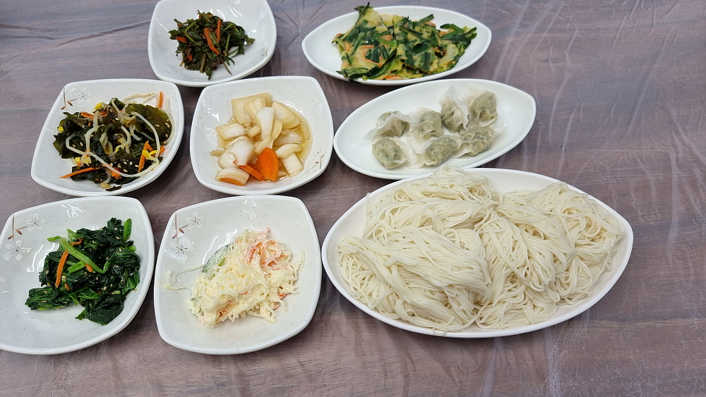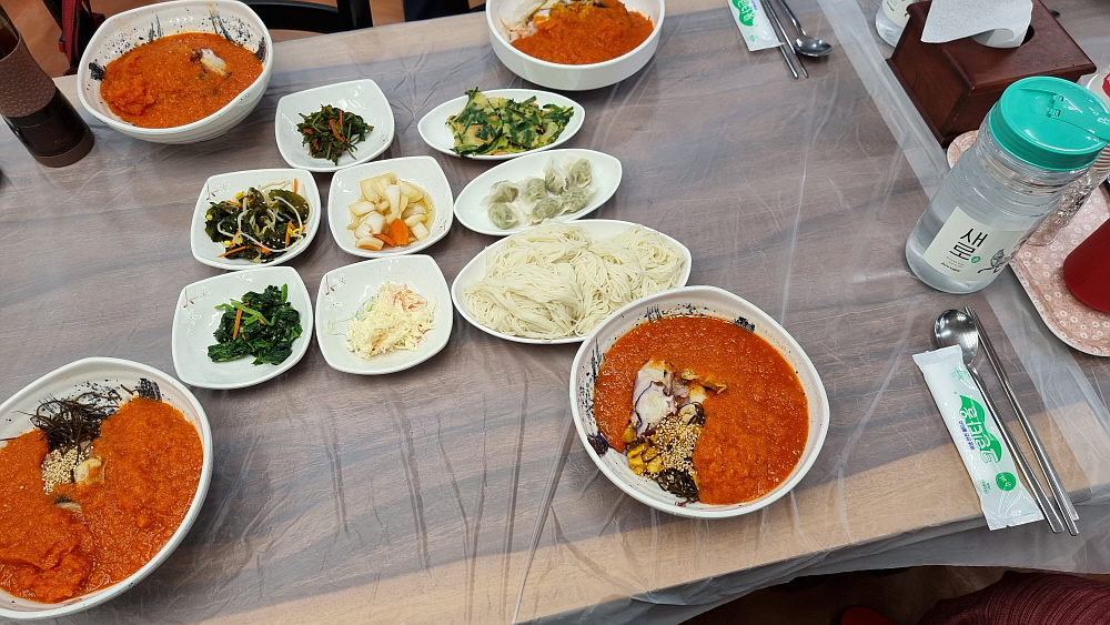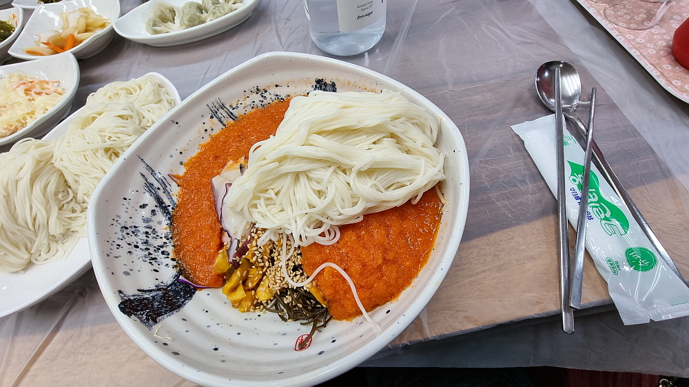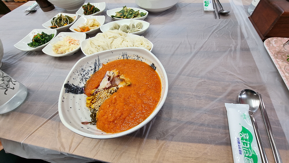 물회는 밥을 말아 먹기도 한다지만 여긴 소면을 주었다. 걸죽하던 물회 소스는 점점 물로 변해갔다. 나중엔 익숙하게 먹었던 물회의 비주얼이 되었다. 거기에 소면을 말아 먹는 것이다. 들어 있는 문어의 쫄깃한 식감과 시큼한 국수를 먹는 것이 거진항의 물회였던 것이다. 함께 간 일행들 중 일부 사람은 이 물회를 다 먹지 못했다. 너무나 생경한 식감과 그닥 덥지 않았던 날씨 탓이다. 아마 날이 더 뜨거웠다면 다들 후루룩 잘 먹었을 것이다. 단체 예약을 한지라 약간의 전과 물만두가 있어 그나마 간단하게 한 잔 하기에 좋은 조건이었다.