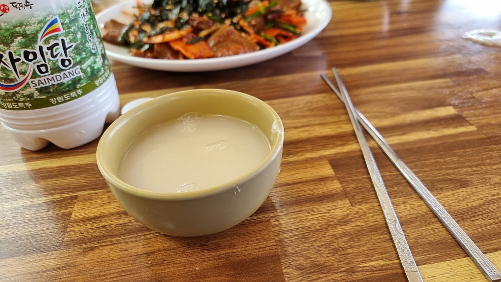 다음 여정은 통일전망대 안에 있는 금강산열차식당이었다. 사실 식당이라기 보다는 실내포장마차에 더 가까운 곳이었다. 말 그대로 열차를 개조하여 식당으로 사용하는 곳이다. 관광지라는 특성 때문에 약간 가격이 있는 편이었다. 여기가 1박2일에 나온 적이 있단다. 점심은 물회로 이미 먹은터라 과하지 않은 안주 겸 요기거리를 찾았다. 그래서 선택한 것이 도토리묵이었다. 가격은 20,000원으로 모듬 돈가스 다음으로 비싼 안주였다. 들락거리는 사람이 많은 탓에 여긴 선불로 음식을 먹어야 한다. 막걸리 하나와 도토리묵, 그렇게 27,000원을 지불했다.