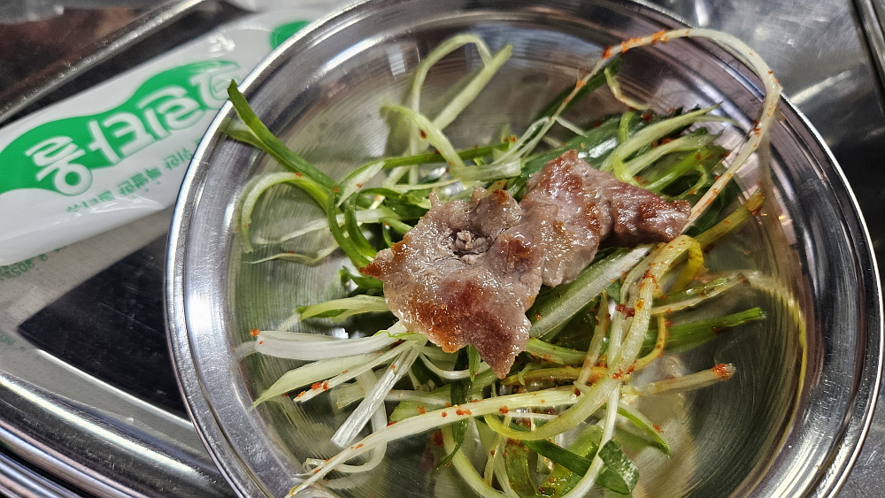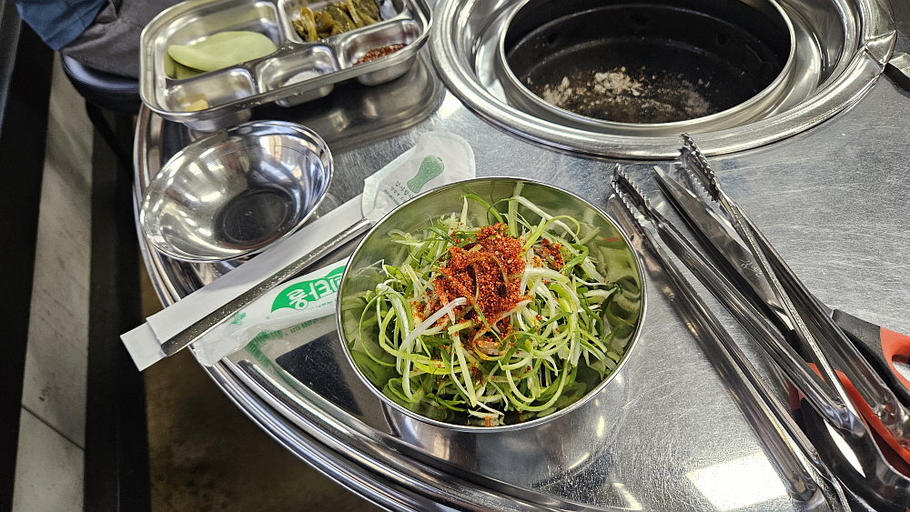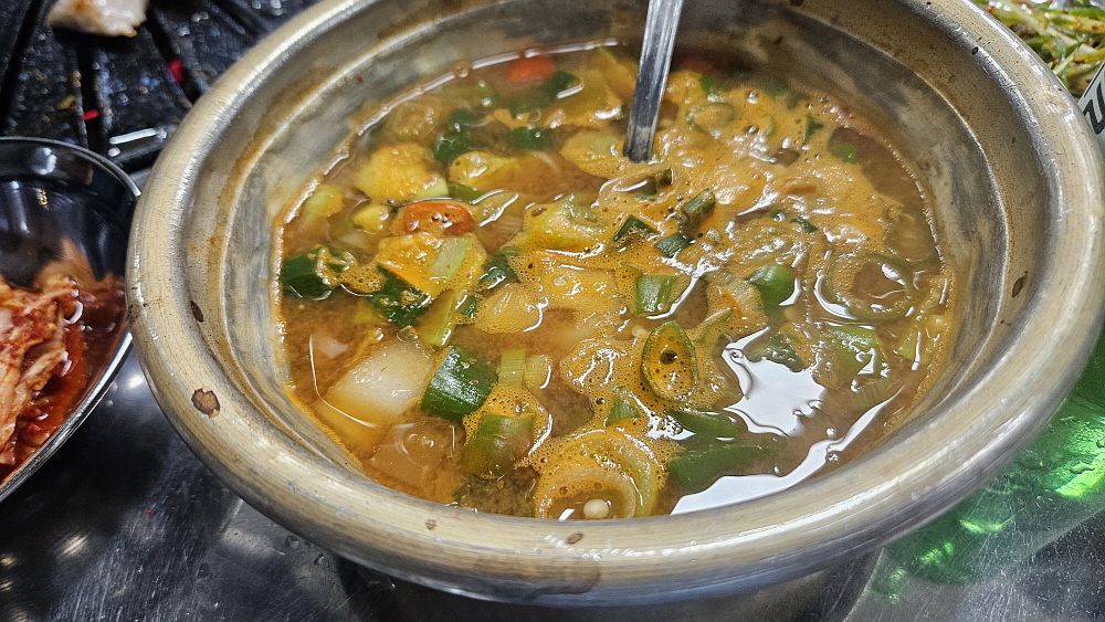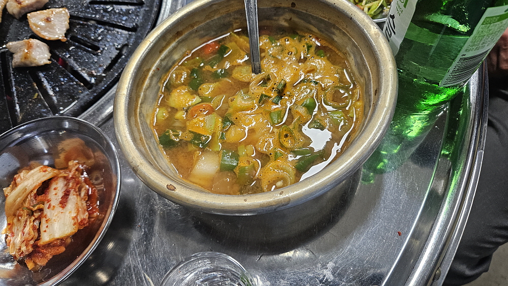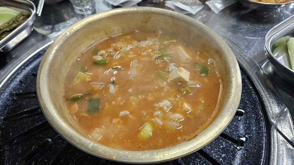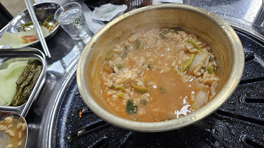 이집은 파절이를 그 때 끄 때 만들어 주는데 그것도 참 맛이 좋았다. 누군가 그랬다. 충청도 청주에서는 파절이가 맛없으면 장사를 할 수 없다고... 그 정도로 파절이와 고기는 궁합이 잘 맞는 조합이다. 우리도 이날 몇 번이고 파절이를 리필하여 먹었다. 된장찌개에 밥을 넣어 밥안주를 먹자는 제의가 나와 그렇게 했다. 고기집의 백미는 나중에 먹는 된장찌개나 김치찌개가 아닐까 한다. 사람에 따라 잔치국수 같은 것으로 마무리하는 경우도 있을 것이다. 우리는 진한 집된장 맛이 나는 찌개에 밥을 두 공기나 넣어 불위에 올려 놓았다. 정말 말 그대로 밥안주다. 그것도 푸짐하고 맛난 정통 한국식이다.
