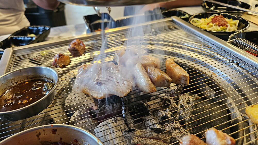고깃집의 전형적인 테이블 세팅이 이루어졌다. 벌겋게 달아 오른 숯불에 불판을 놓고 그 위에는 멜젓인지 갈치속젓인지 먹어 보고도 잘 구분이 안가는 젓갈이 있었고, 김치를 기름에 담가 고기를 구우면서 김치도 구울 수 있는 시스템으로 구성되었다. 새송이 버섯에는 이집의 상호인 포천식껍이라는 상호가 서부시대 소들에게 문신 새기듯 불판으로 찍어 놓았다. 그런데 참 희안한 것은 등심덧살이었다. 고기가 동그랗게 말려 있었다. 거참 낯선 비주얼이네... 그리고 고기의 두께도 아주 두툼한 편이었다. 이걸 제대로 익히려면 시간이 좀 걸릴 것 같았다. 제주도의 뭉텅이 고기처럼 말이다.