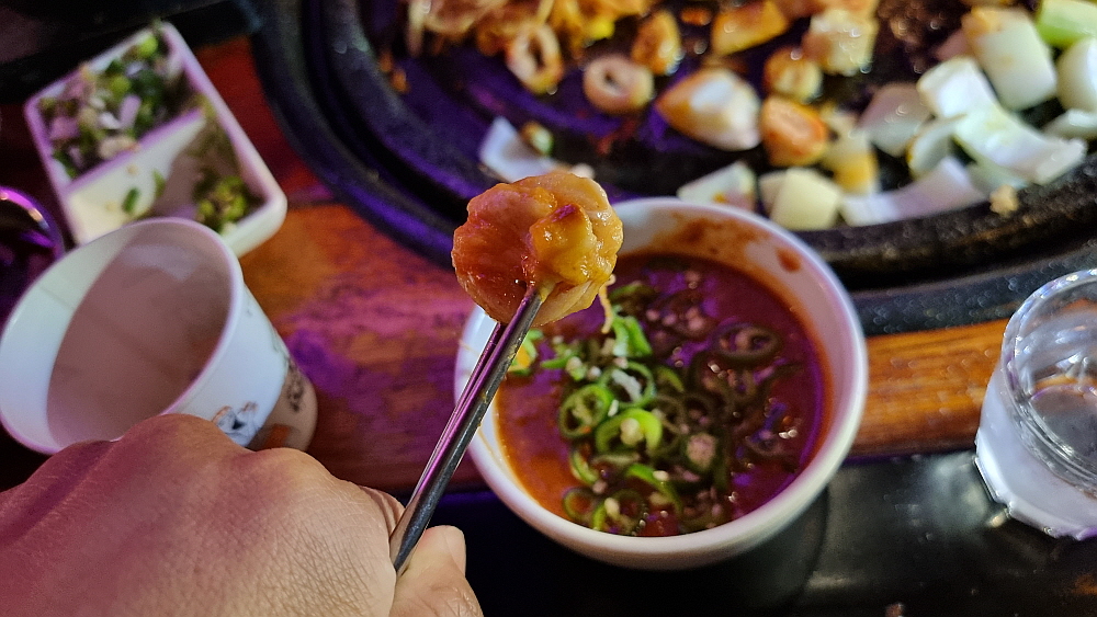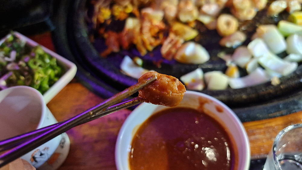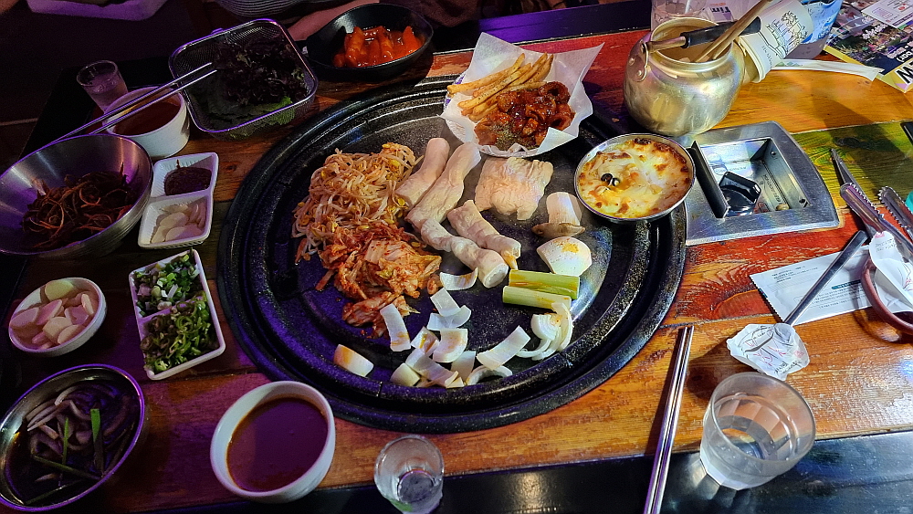 이렇게 오뎅국물이 나오는 줄 알았다면 된장찌개는 따로 주문하지 않았을텐데 그것은 실수였다. 막창에서 나오는 기름에 콩나물이나 김치까지 구워 먹으니 진수성찬이 따로 없었다. 완전 안주의 천국이다. 이래서 가성비 좋고 맛난 집이라 하는 모양이다. 요즘들어 많이 느끼는 것인데 이상할 정도로 경상도의 물가가 수도권보다 많이 싸다. 이유는 잘 모르겠다. 어딜가나 경상도 쪽은 물가가 참 착하다는 생각이 든다. 하긴 대전에서도 이런 말을 하긴 했는데 그럼 지방은 다 저렴하고 서울과 경기도만 비싼가? 이런 저런 얘기는 하는 동안에 드디어 우리가 기대했던 막창이 먹기 좋게 익었다.