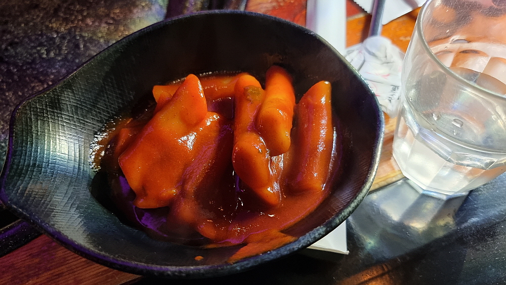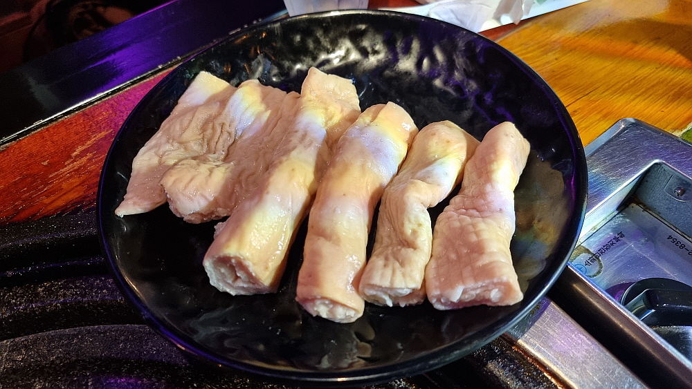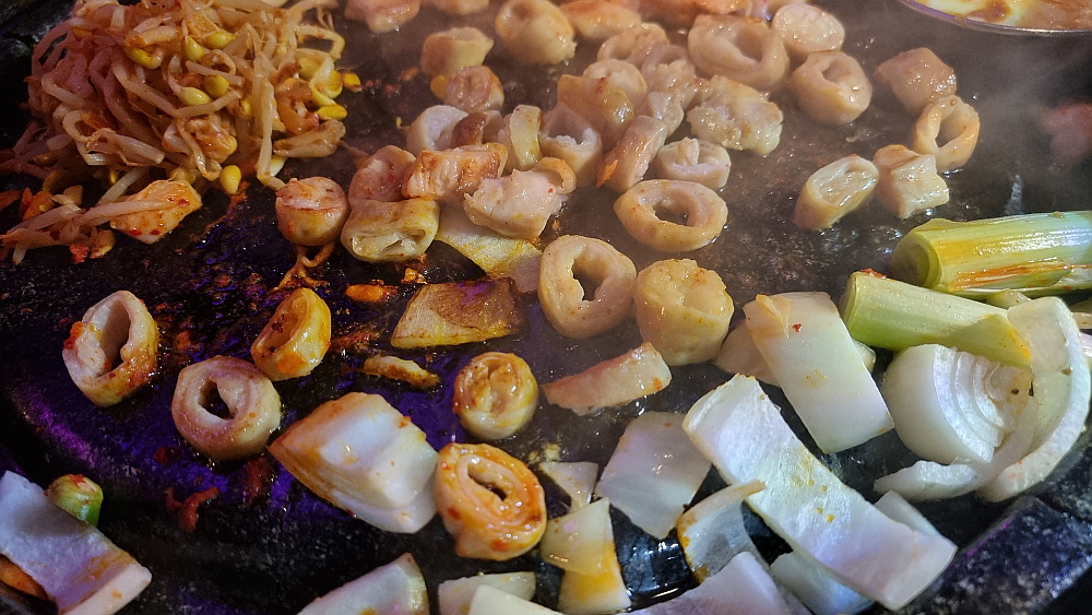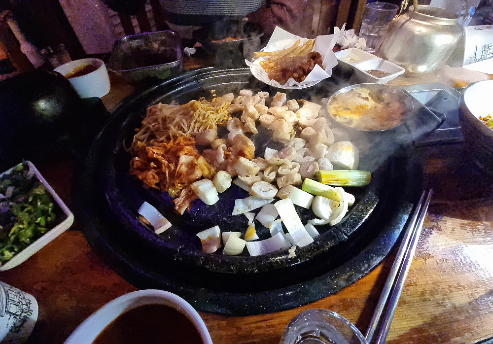 그렇게 단촐한 막창이 한 접시 나올줄 알았는데 반찬이 계속 나왔다. 이것만 있어도 술 안주 할만하다 싶을 정도의 반찬들이 너무 많았다. 특히 떡볶이와 오뎅은 그 자체로 전문점의 그것과 맛이 비슷하다 할 정도였다. 우리가 주문한 막창이 나왔는데 비주얼이 우리가 알던 그 막창이 아니었다. 원래 막창은 이렇게 생겼는 모양이다. 우린 항상 잘라져 있거나 네모낳게 생긴 막창만 봤는데 말이다. 커다란 팬 위에서 막창을 굽는 방식인데 마치 춘천의 닭갈비를 연상케 하는 비주얼이었다. 식당이지만 조명이 주점처럼 어두워 사진은 좀 그렇게 찍히기는 했다.