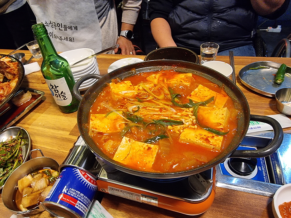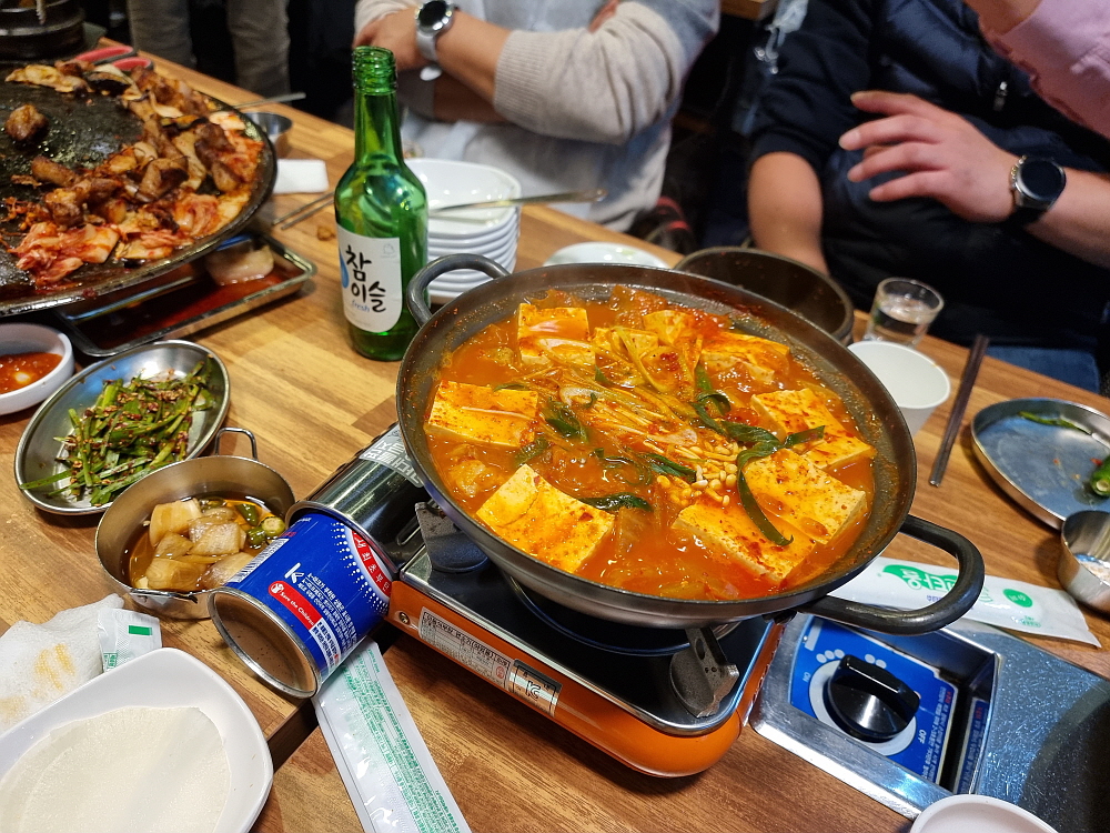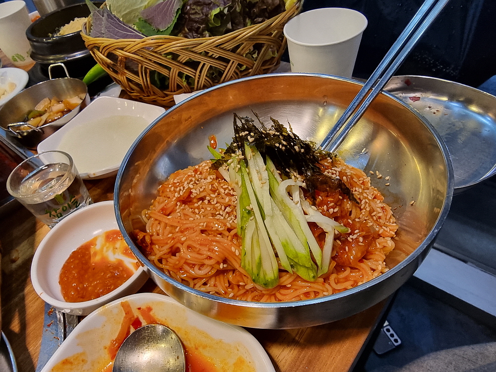 이집의 또 다른 특징은 고기를 먹은 뒤에 여운을 남기는 또 다른 음식들이 많다는 것이다. 우리는 김치찌개를 주문했다. 이 메뉴는 원래 점심에 주로 파는 것이라 했다. 하지만 고기로 물든 기름진 입안을 토종의 맛으로 닦아내기에 이만한 것이 없을 것이다. 거기에 요즘 고기집에서 유행하는 비빔면도 주문했다. 이런 식으로 먹다보면 정말 이자리에서 일어나지 못할지도 모르겠다. 끝도 없는 음식의 향연이다. 그런데 이런 구성이 참 알차고 맛나더라는 것이다. 그냥 흔히 먹었던 삼겹살이 아니라 진정한 고기 회식의 마무리를 본 것 같다. 그래서 이집이 인근에서 인기가 좋은가 보다.