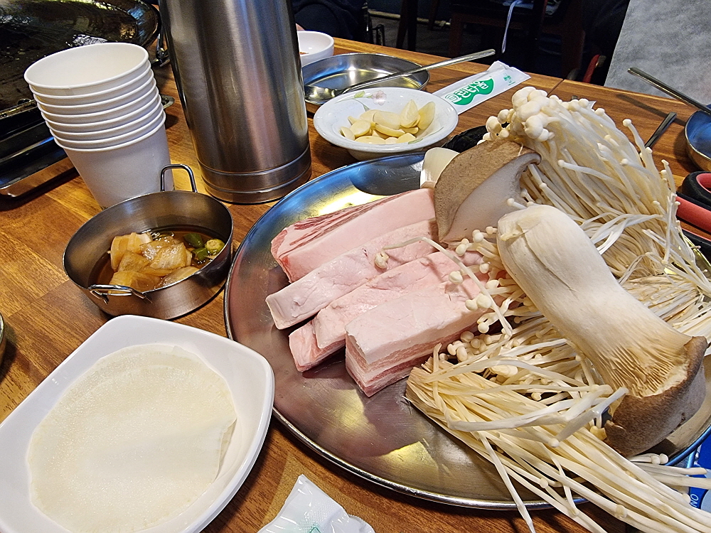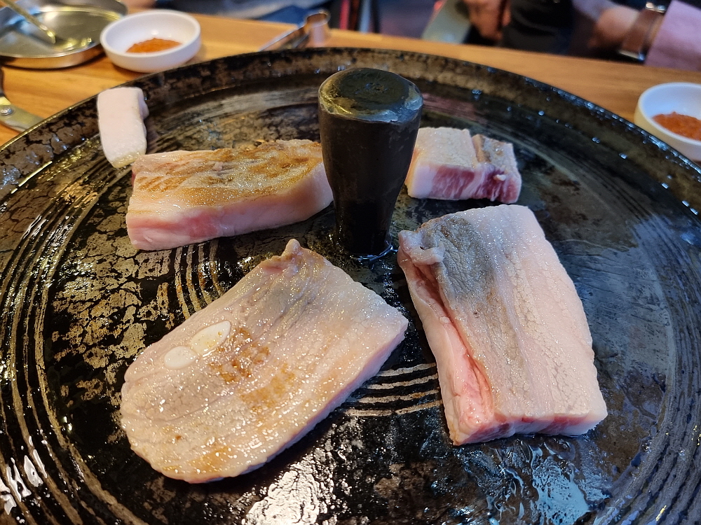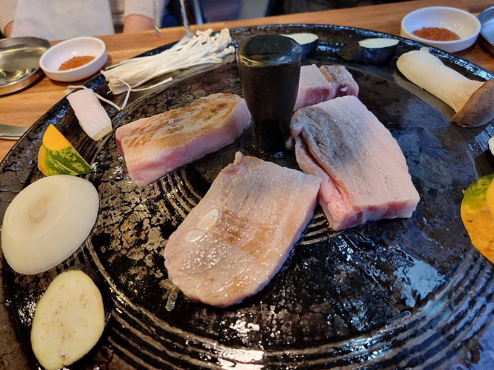 한국인들 특히 아재들의 저녁회식 1순위 아이템은 언제나 삼겹살이다. 개인적으로 좋아하지 않는다고 해도 한 달에 서 너번은 먹을 수밖에 없게 되는 진정한 회식 음식이다. 이렇게 인기가 많은 메뉴다 보니 삼겹살은 온갖 변형으로 다양하게 발전해 왔다. 몇 년 전 제주에서 주로 먹는다는 두툼하고 묵직한 삼겹살이 인기를 끈적이 있는데 제주에서는 근고기 라는 이름으로 팔리기도 했단다. 이날 가본 집은 근고기와 비슷할 정도로 두툼한 고기를 자랑하는 삼겹살집이다. 이름하여 고읍의 꽃돼지 삼겹살 집이다.